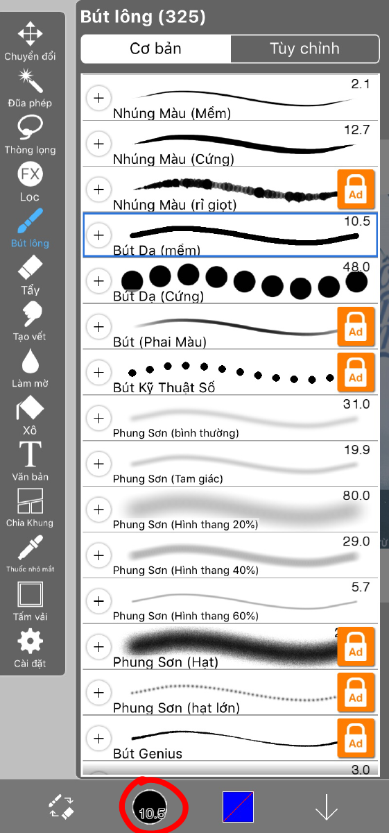 Giờ lại nhìn sang cái thanh bên trái (Xem lại bước 4.) Chọn "bút lông" -> Chọn cái biểu tượng mà tôi đã khoanh đỏ và nó sẽ hiện ra cái bảng (Tôi dùng bản free nên phải xem quảng cáo mới được dùng thêm các loại bút khác.) -> chọn "Bút Dạ" (Chọn "mềm" hay "cứng" là tuỳ bạn, cái này cũng không ảnh hưởng đến việc cắt cho lắm.) -> Nhấn lại cái biểu tượng ban nãy để tắt cái bảng đi (hoặc bạn nhấn ra phía ngoài cái bảng để tắt.)