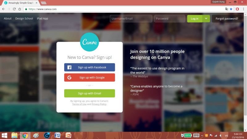 Trước hết, bạn hãy vào Google và tìm cụm "Canva.com". Giao diện bên dưới sẽ xuất hiện và yêu cầu bạn đăng kí miễn phí bằng Gmail hoặc Facebook. Thao tác này rất quan trọng để lưu giữ những bản thiết kế của bạn về sau. Và nếu trang web có tải hơi lâu thì mình rất mong các bạn chờ đợi một chút, vì Canva được lựa chọn sử dụng bởi hàng triệu người trên toàn thế giới.