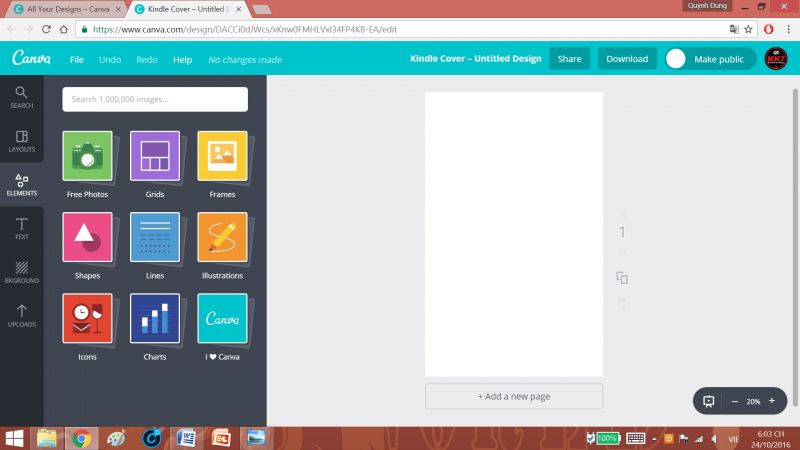 - Elements: Nguồn tài nguyên. Đây là những chi tiết bạn có thể đưa vào bìa sách của mình, và đa phần tài nguyên chỗ này là miễn phí, chỉ cần bạn kiên trì tìm kiếm theo cách thủ công. Phần này mình sẽ nói rõ hơn ở phần sau.