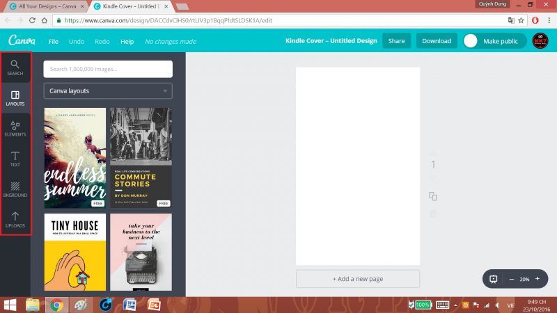Từ bước 5 này, mình sẽ trực tiếp hướng dẫn các bạn cách tạo một bìa sách. Và lưu ý quan trọng nhất mà mình phải nói đầu tiên: Save First (Lưu hàng đầu): Hãy tạo ra một thói quen lưu những thay đổi của bạn trong 5 hoặc 10 phút một lần. Canva được sử dụng bởi người dùng trên toàn thế giới, và bạn sẽ không thể biết lúc nào phần mềm quá tải và xóa mất những thay đổi của bạn đâu!