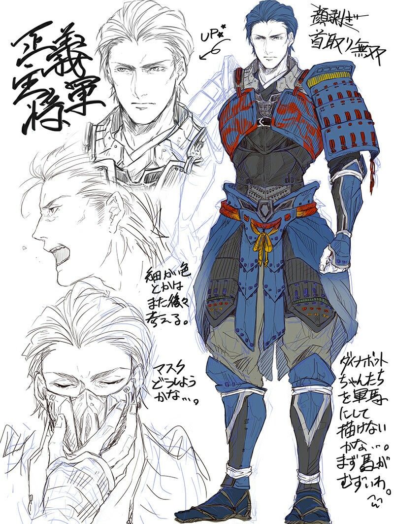 The suit of armour is unique in shape and form; it is an ancient samurai armour, with plated shoulders and chest piece, the armour being in blue with red flames, the under armour shirt in black, the forearms being in blue and extending down to the hands, the codpiece in blue and tied around his waist, dark tannish brown pants under the armour, with sleek armour pieces for the lower legs, and sandal-like shoes for the feet.