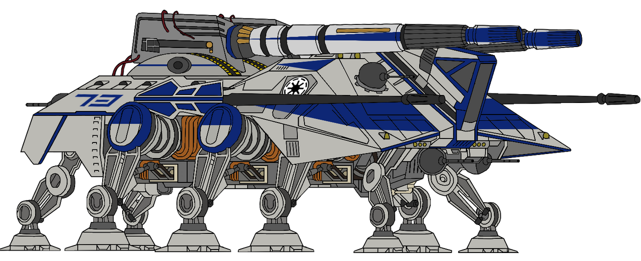 it 2 AV-7 Anti-Vehicle cannons mounted on the hull. and has retractable durasteel spikes in each foot to embed into the ground to withstand the recoil of the heavy cannons, the walker can walk and fire the cannons as long as the spikes are activated.