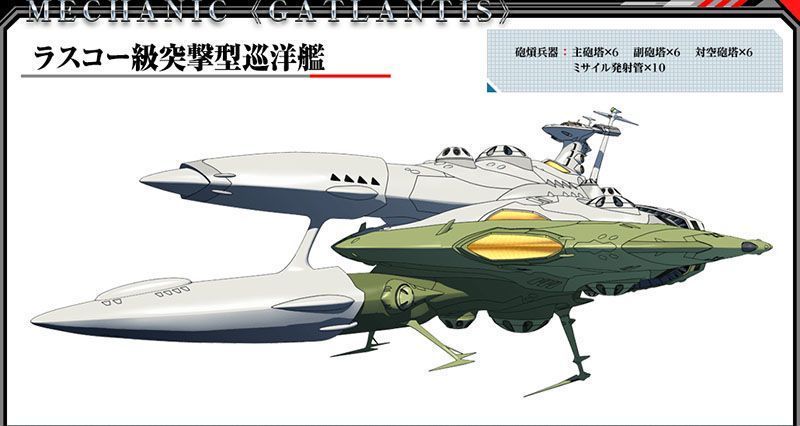 A heavily armed, high-speed cruiser that serves as the core of the Gatlantis fleet. Besides a large number of rapid-fire gun turrets, including the main gun and anti-aircraft guns, the bridge structure is equipped with a total of 10 missile launch tubes.