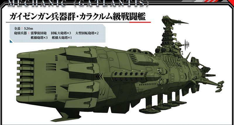 This heavy Gatlantis battleship wields a "Flame Strike Gun" that warps a powerful blast of energy to allow for long-distance bombardment from outside an opponent's range. Yamato met with a similar warship on its return from Iscandar, which has since been mass-produced and deployed with the Gatlantis fleet in large numbers.