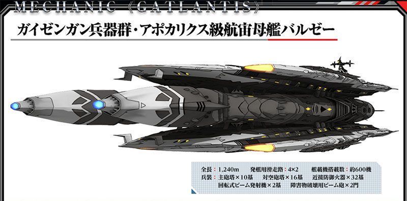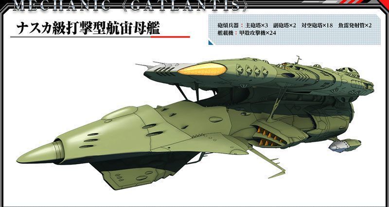 The main aircraft carrier of the Gatlantis task force. The recessed portion of the upper hull is a flight deck with carrier-based fighter divisions stored on either side. The main gun, secondary guns, and anti-aircraft guns are in storage compartments on the upper and lower hulls. It is equipped with missile launchers on the forward hull and has high attack power.