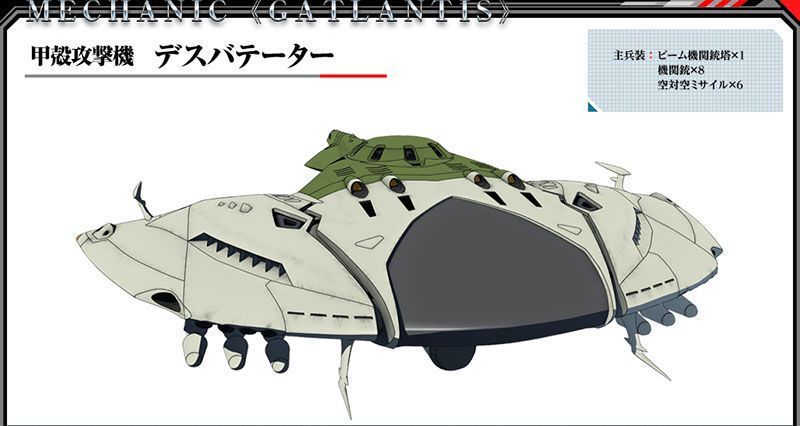The main assault fighter of Gatlantis. It is equipped with a rotary beam machine gun (quick-fire rotating turret) on its upper surface. 8 machine guns are fixed on the front of the hull. It is piloted by a crew of three, and carries six air-to-air missiles on its underside, or it can mount a single large anti-ship missile.