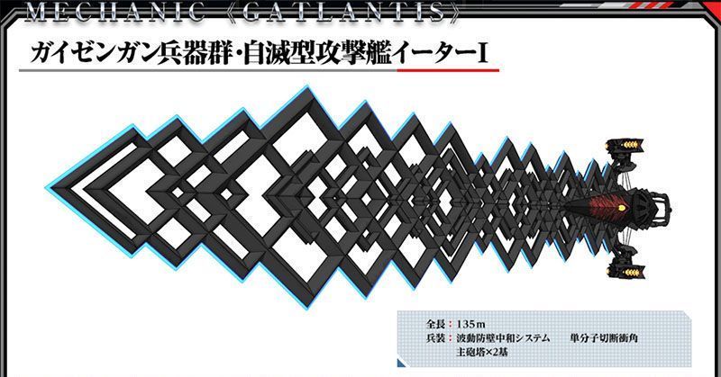 A destroyer that attacks enemy ships with high mobility. The quick-fire gun turrets that are unique to Gatlantis warships vastly improve accuracy by "scattering" a large amount of deadly energy. With this, its focus is to deal out as much damage as possible to an enemy.