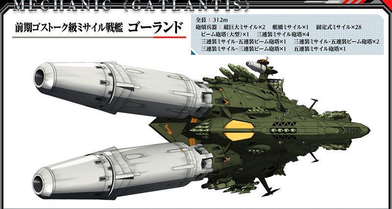 A large missile ship that serves as the flagship of a fleet lead by Goland, one of the great commanders of Gatlantis. The two ultra-giant missiles in the bow are used to annihilate enemy fleets and for planetary strategy. In addition, the two large rounds can be replaced by other warheads according to strategic demands. Although it is impossible to reload the bow missiles at the front line, the turrets and fixed weapons are capable of continuous fire and reloading.