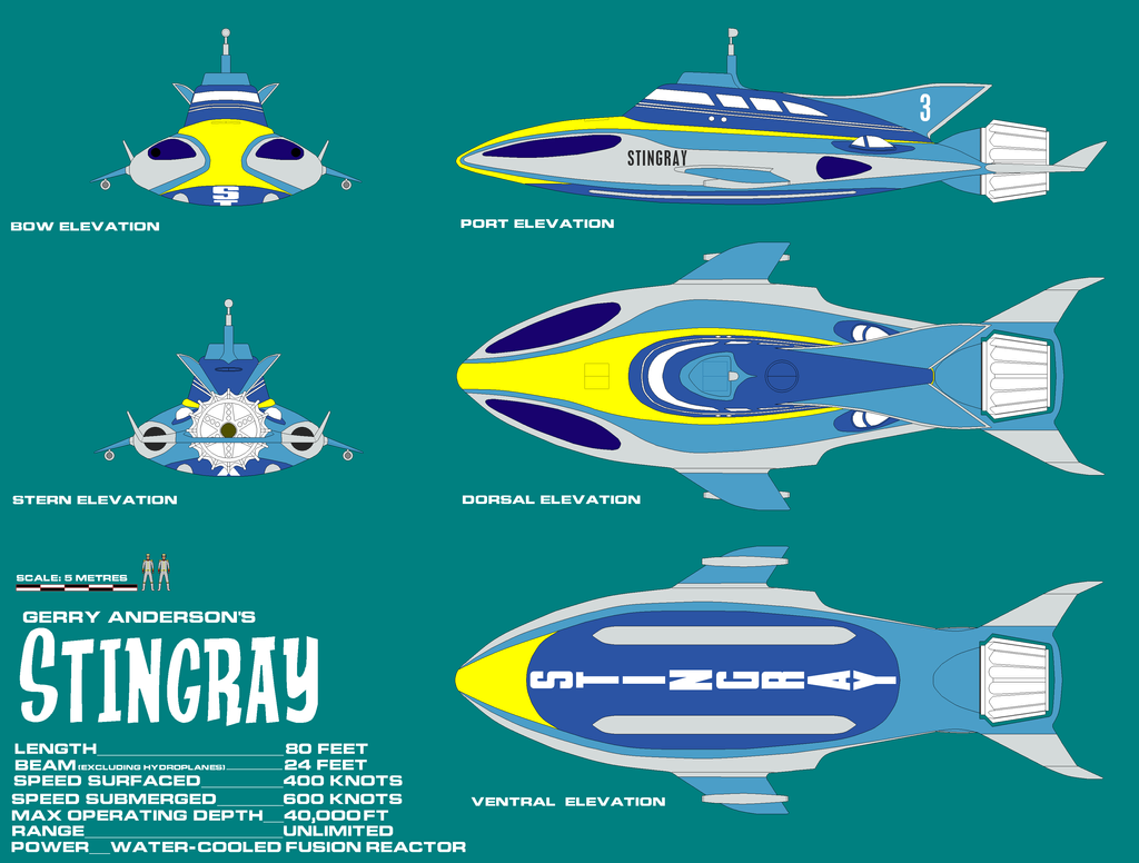 now Stingray is a Sub and it has a Length of 85 feet aka 30 meters with a Width of 20 feet, when suface it has a Displacement: if 265 tons and when underwater it is 320 tons, it also has speeds of 400 knots above water and when underwater 600 knots and a range of unlimited meaning it can go all around the world and it has a max depth of 40,000 feet