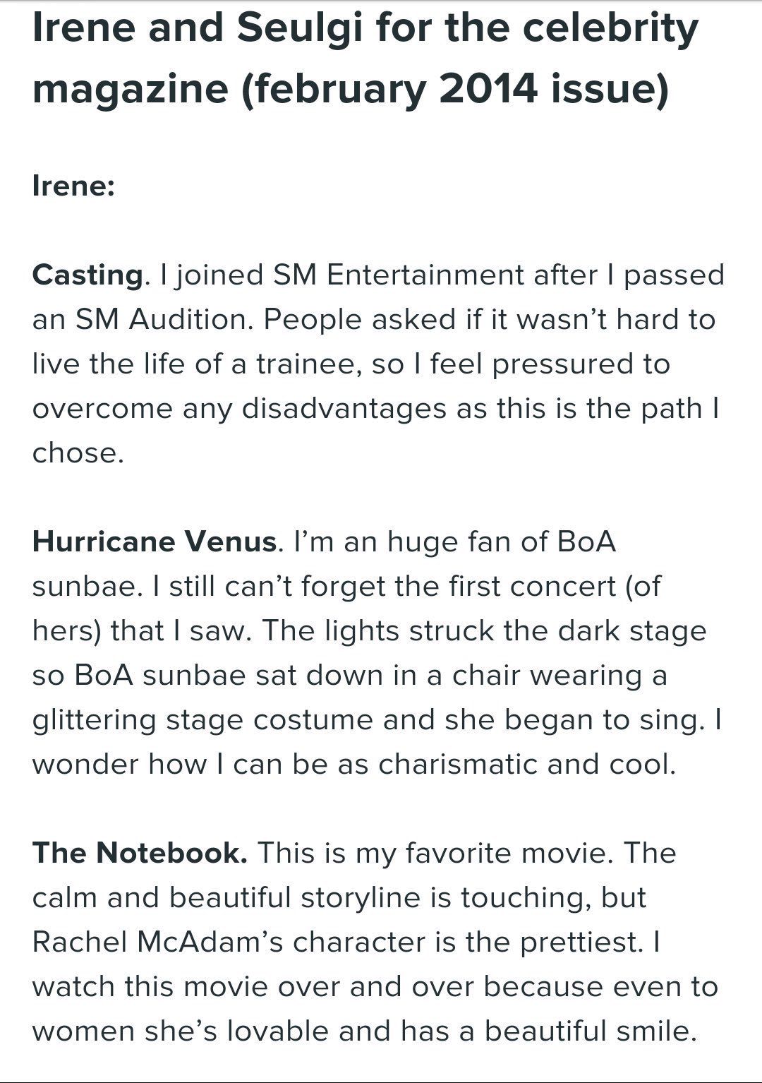 23/08/2018, chương trình Ji Sukjin's 2PM Date, khi được hỏi muốn được ăn tối cùng người nổi tiếng nào, chị đã trả lời là diễn viên Han Jimin. Chị cũng thừa nhận là bản thân thích Tteokbokki là bởi vì Han Jimin cũng thích 😅 (chị Irene có cái tật là crush thích gì, bả thích theo hay sao á)