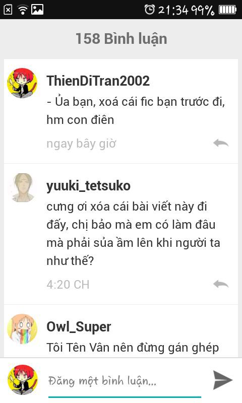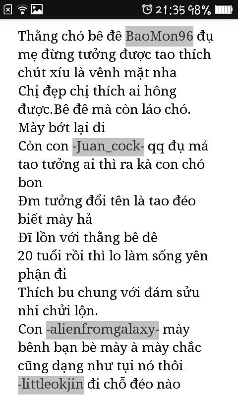 - Xin nói nhé, sao bạn không xoá trước đi, à N ơi, sinh năm 2k hay 2k4 vậy ? Mặt dài tới mông hay chân vậy ? Người phụ nữ mọc râu ? Ahihi, đồ điên.