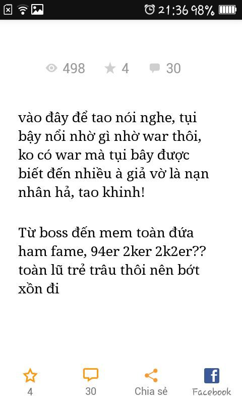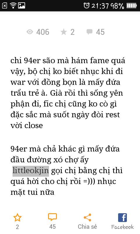 - Khinh đi bạn ạ, tôi chẳng quan tâm đâu , tôi hám fame là nhờ viết truyện người ta thấy hay đâu như bạn, viết rant kiến follow lol.