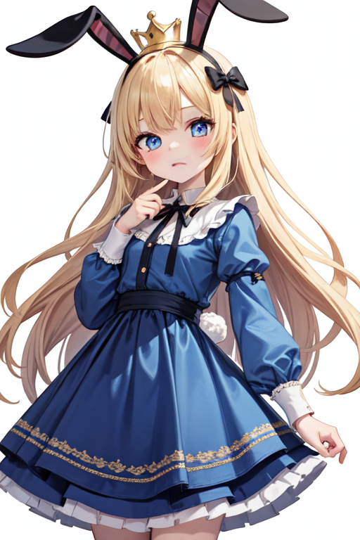 Trên hết thảy, thứ thật sự thu hút ánh nhìn của tôi là người ngồi cạnh đức vua. Một cô bé có làn da trắng hồng ấy có lẽ chỉ cao ngang Rote, song lại có mái tóc như ánh vàng đổ xuống lưng. Trên đầu là một đôi tai thỏ đen khác biết với màu tóc, thế nhưng nó lại làm nổi bật thêm chiếc vương miện nhỏ lấp lánh sắc vàng. Tương phản với màu rực rỡ của chúng là chiếc váy một mảnh dài màu xanh dịu nhẹ của hồ nước. Dựa trên những chi tiết về vẻ ngoài đó, xem ra cô bé này là Queen Alice mà Mad Hatter đã đề cập!