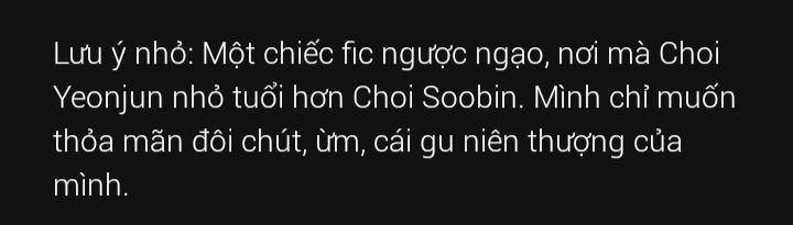 "Lúc kể nhìn mặt ảnh nghiêm túc lắm." Kai chống chế. "Cho nên Yeonjun hyung phải thật cẩn thận đó nha. Cái tính thẳng thắn thái quá của anh làm em phiền muộn thật sự."
