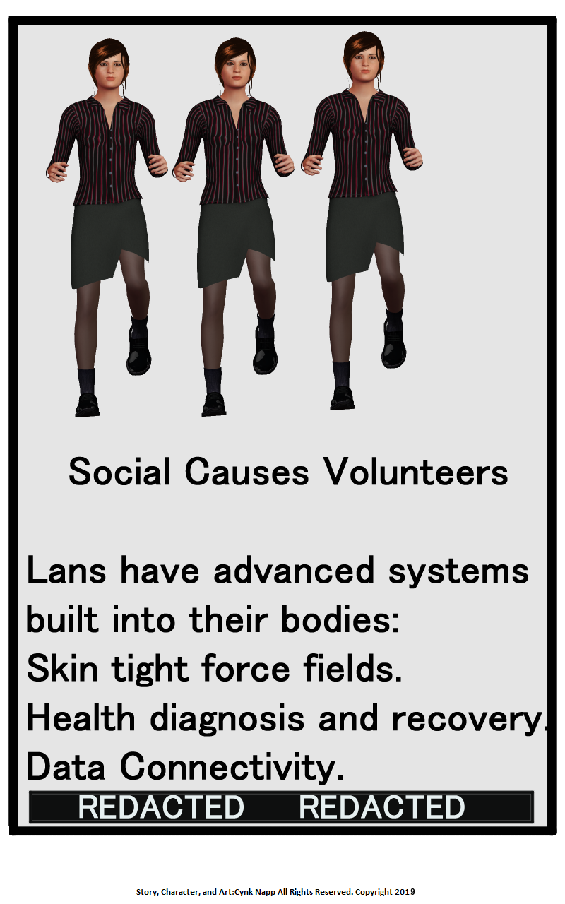 Each of the three elLans with ArlowTsai are volunteers for social causes. Like many Lans (usually youngish adults) that think their planet's Governance and Security operations are sometimes inefficient. The causes groups generally have agreed upon sequences of non-system communication using eye and mouth movements. The elLan behind Arl has gotten confirming sequences from the other two. She never met them before today.