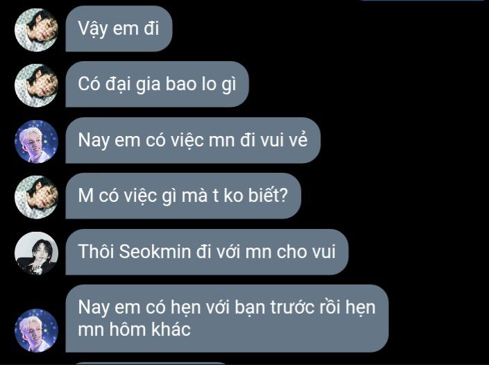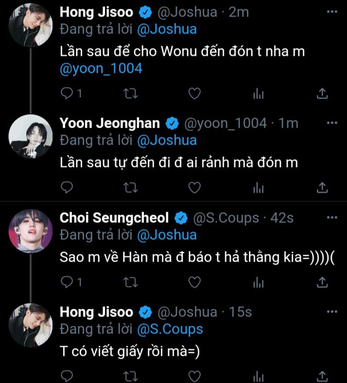 Cậu nghe đến tên ba mẹ mình thì cụp đuôi lại không dám ngoe ngẩy nữa cũng tại cậu rất sợ Jeonghan và ba mẹ Hong lắm lần trước cậu đi sang Mỹ mà không nói lời nào lần này về cũng không báo nên anh cực kì sợ luôn