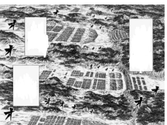 049: Stand back. Up in the air there is swarm of big flying ants carrying some ants. One of the flying ants drops the ants they were carrying. The ant lands in the ground then charges at the lion heads. The ant blew up spewing a toxic liquid that melts the lion heads.