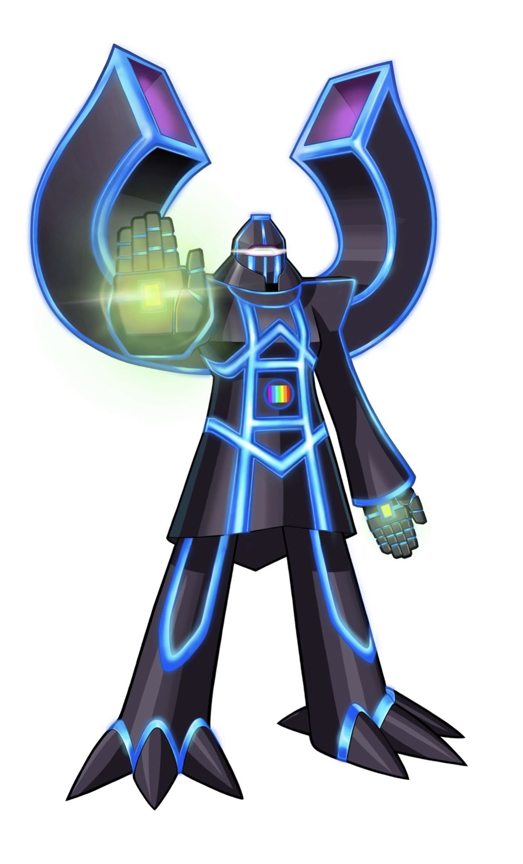 1765-2: Here we have is Dark Battlecats. As we the know Battlecats is infected by the Sigma virus and is under Sigma's control. Because of the virus he turned into a Maverick or a dark evil version of himself. In his Dark Battlecats form Battlecat's battle cards damage are increased by 50% and so is his Mega Buster he can now charge his Mega Buster up to 10 times. He also gained some dark battle cards that he can use only in his dark form and gained some extra abilities like his "Mu Barrier" he can summon a indestructible barrier but can only block one attack and will regenerate in a bit after being used. Then there is his "Auto Lock" ability where he locks into his target dashes towards them to attack them and then returns to his previous location. The story also forgot to mention that Battlecats has a forcefield around him capable of protecting him from the destruction of the CyberWorld which is the Internet Dark Battlecats should still have the same force field if not greater. In case if Battlecats were to die his body will just transfer itself to that little crystal he has floating on his open body. The crystal will just serve as a respawn for Battlecats and the crystal itself it's impossible to break.