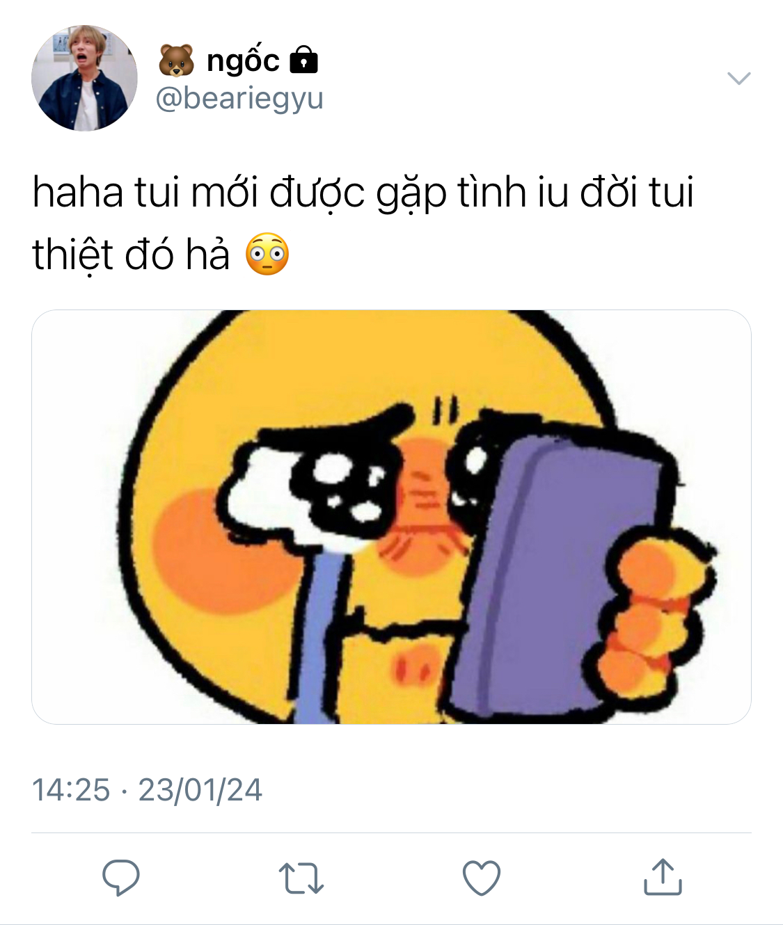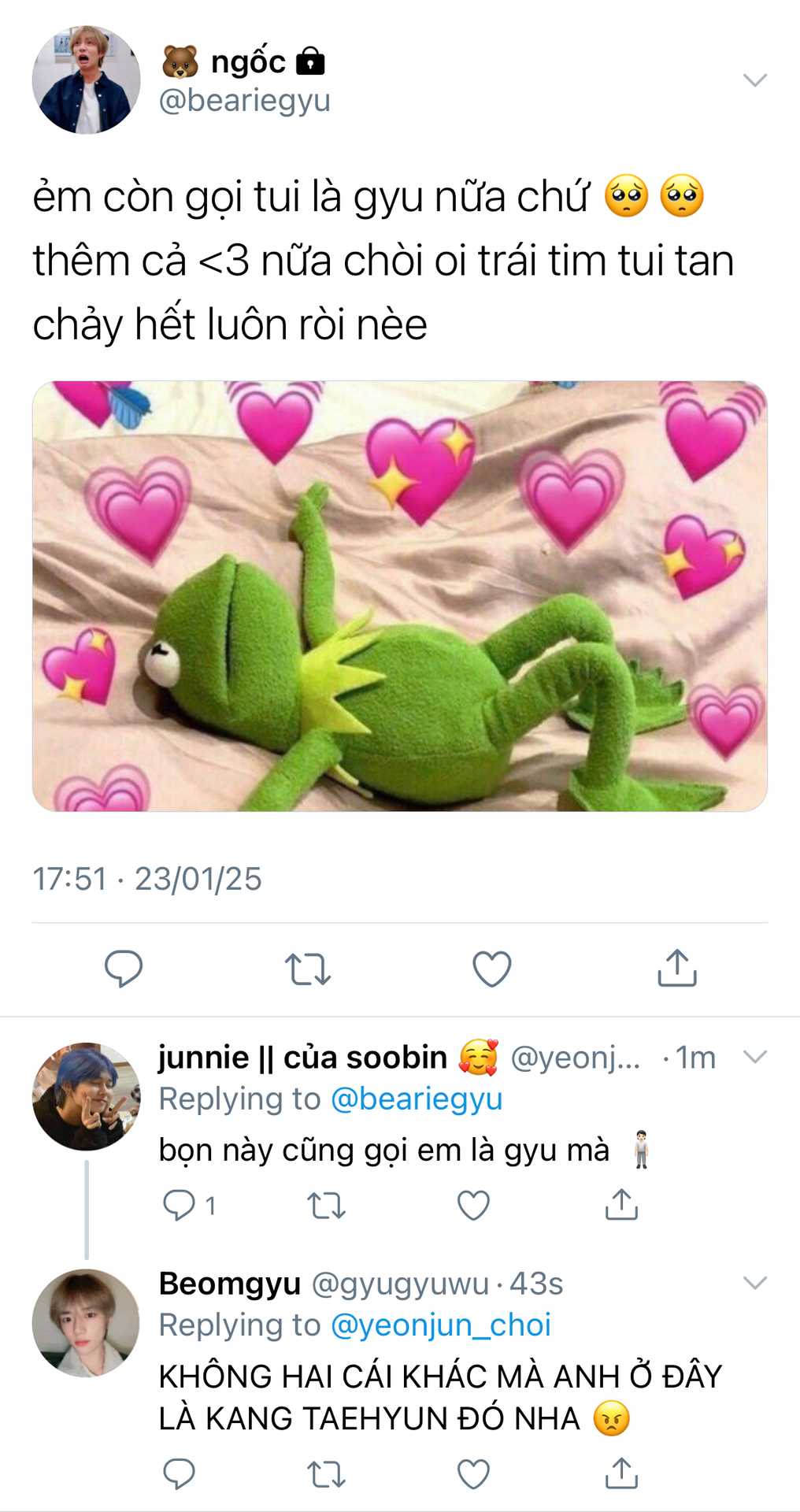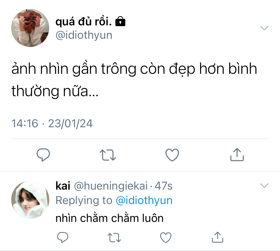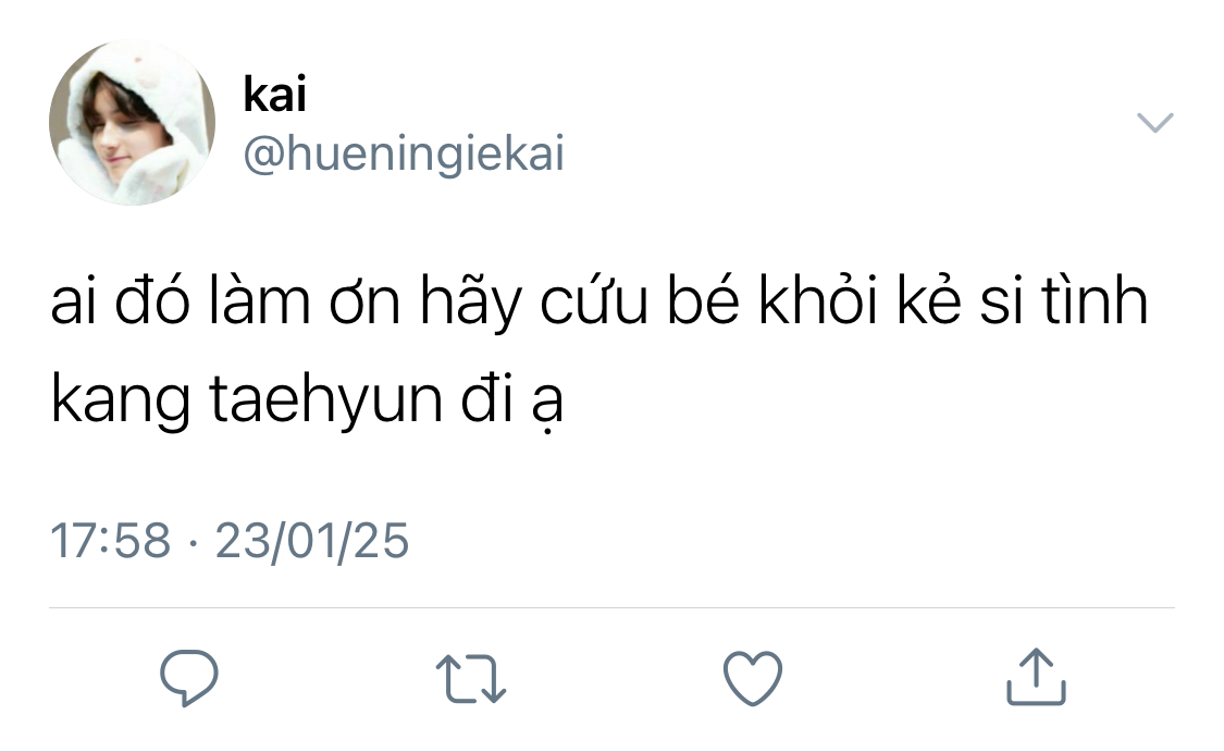 Kang Taehyun đang ở đó kìa, ở ngay trước mặt Beomgyu, trông vẫn hút hồn như mọi khi. Beomgyu cố gắng nói cái gì đó như kiểu xin chào này kia nhưng tất cả từ ngữ đều nghẹn ứ lại trong họng nên anh chỉ đứng đó há hốc miệng nhìn Taehyun.