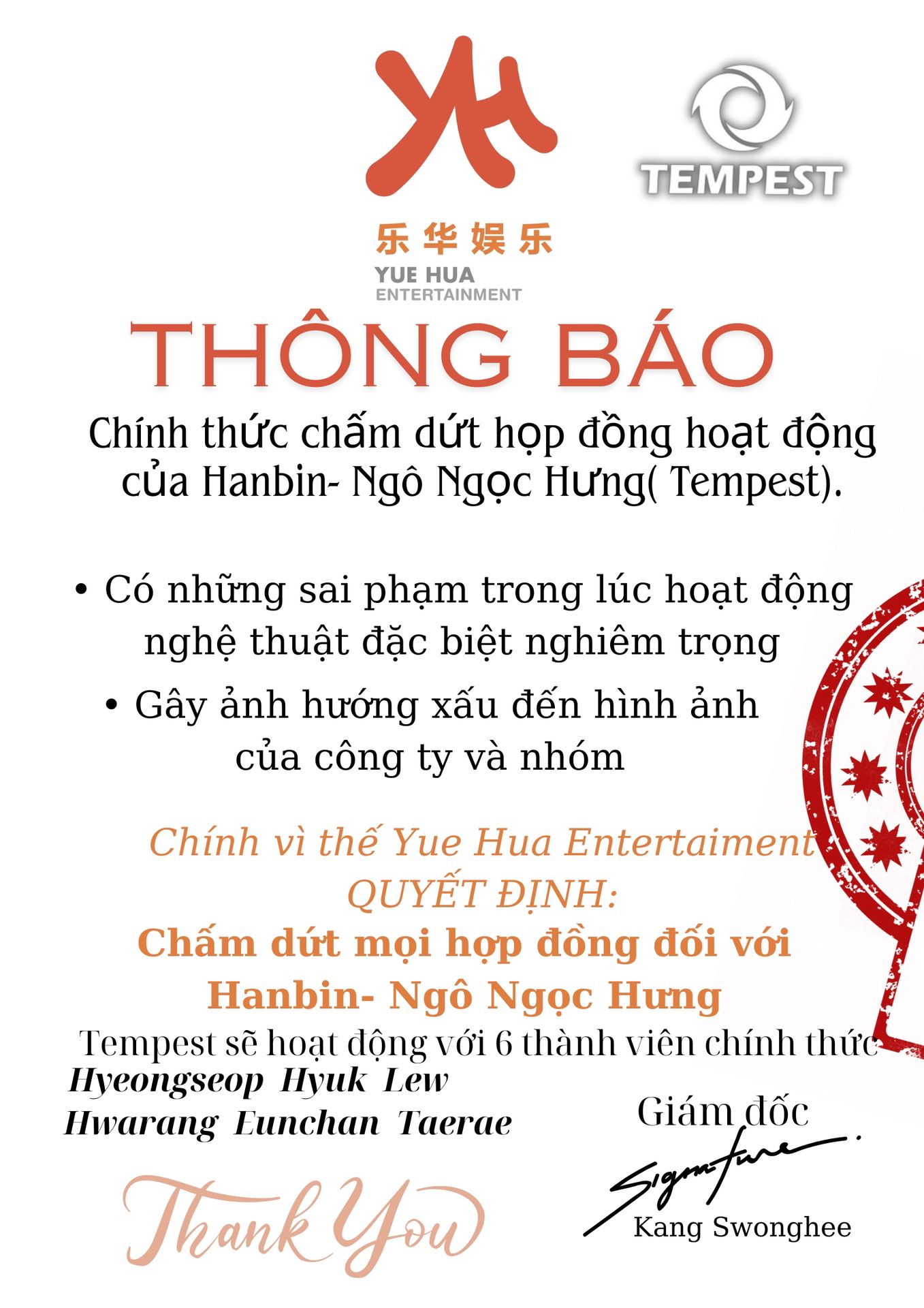 Trong một phiên live,cả 6 người đều nói thay cho anh,khi vừa nhắc đến Hanbin,quản lí Kang đã tắt live kịp thời,anh không muốn thấy chúng tự nhảy vào vực sâu không đáy như Hanbin đâu