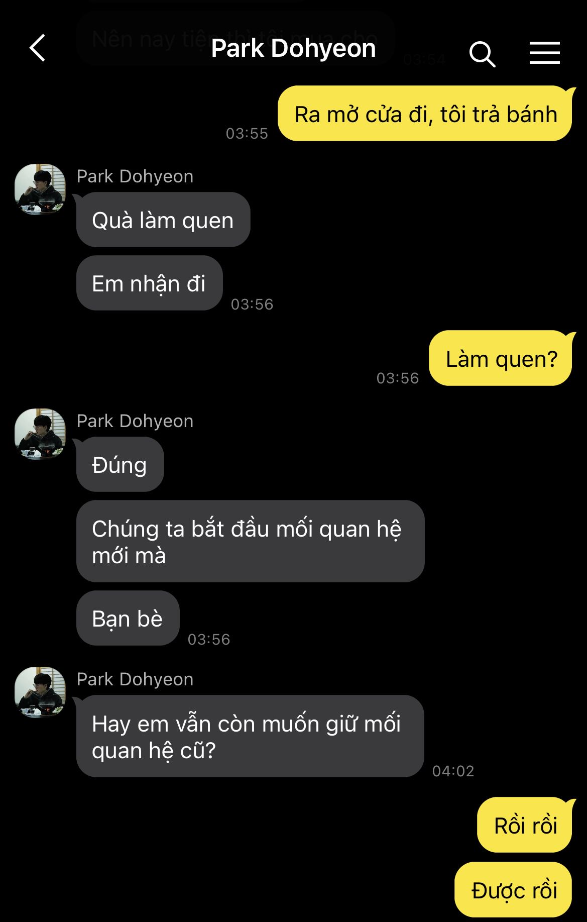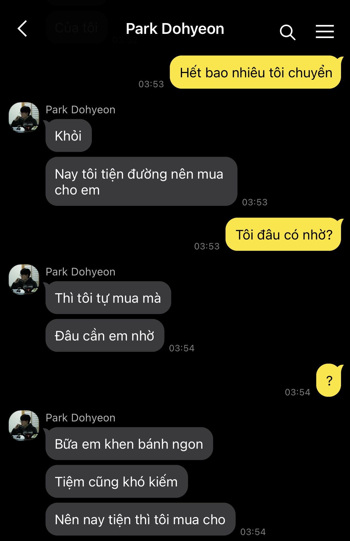 Nhắn xong dòng tin ấy, Hyeonjun khẽ thả điện thoại xuống. Màn hình vẫn sáng, in hằn dòng chữ "quán cà phê Your" - một cái tên ngắn ngủi nhưng nặng nề đến mức như có thể bóp nghẹt lồng ngực cậu. Không phải cậu không nhớ, mà là không dám nhớ. Chính bản thân Hyeonjun không muốn chạm đến nơi ấy, cái nơi đã chất chứa quá nhiều kỷ niệm giữa cả hai.