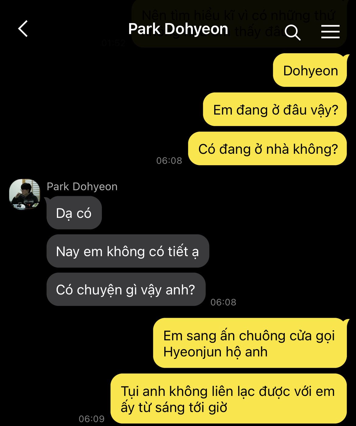 Park Dohyeon đọc xong tin nhắn, không nghĩ ngợi gì liền chạy ra ngoài nhấn chuông nhà "hàng xóm". Một tay cầm điện thoại gọi cho Hyeonjun nhưng chỉ nhận được tiếng tút tút trong vô định, tay kia nhấn chuông cửa, 1 hồi, 2 hồi, vẫn không thấy động tĩnh gì.