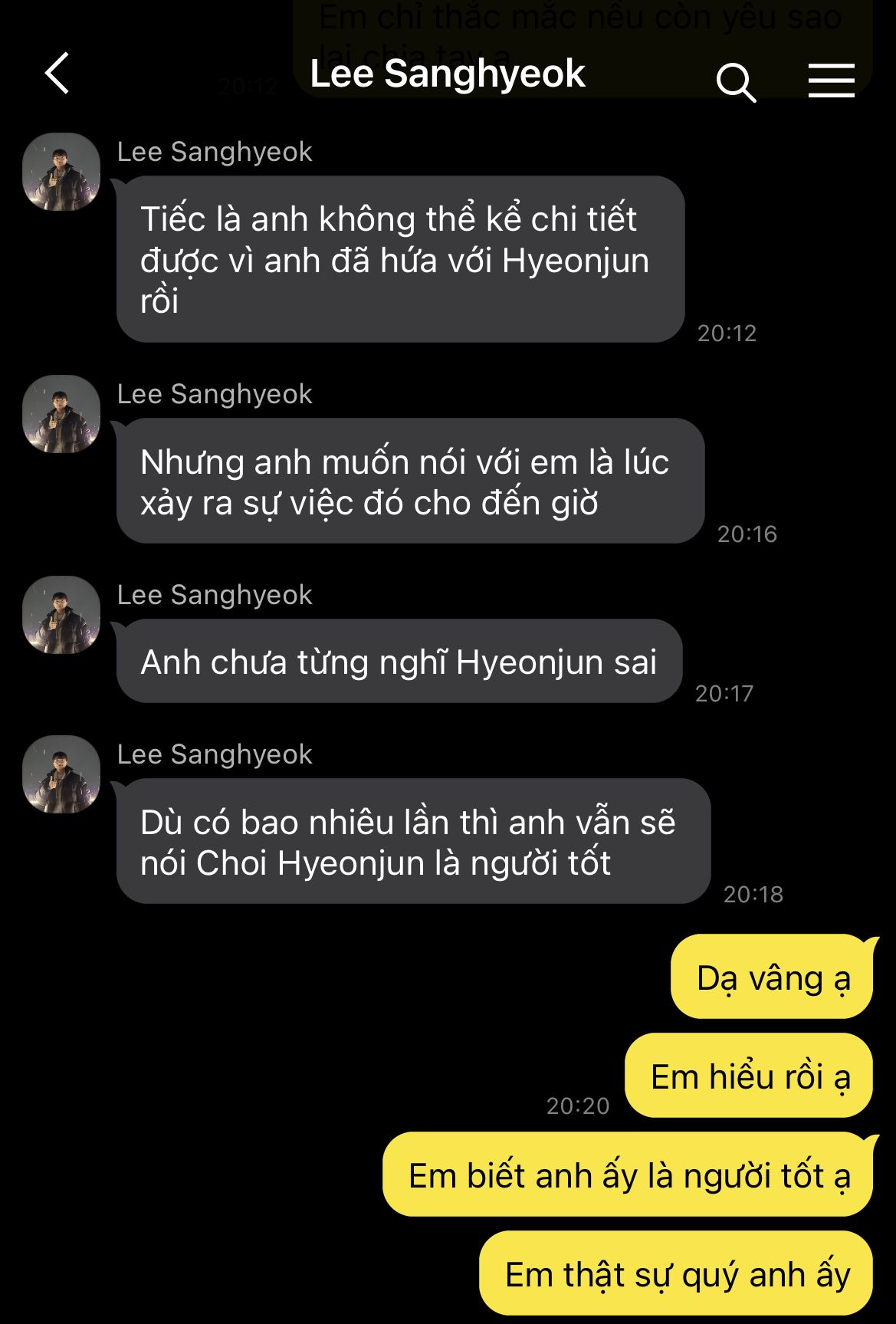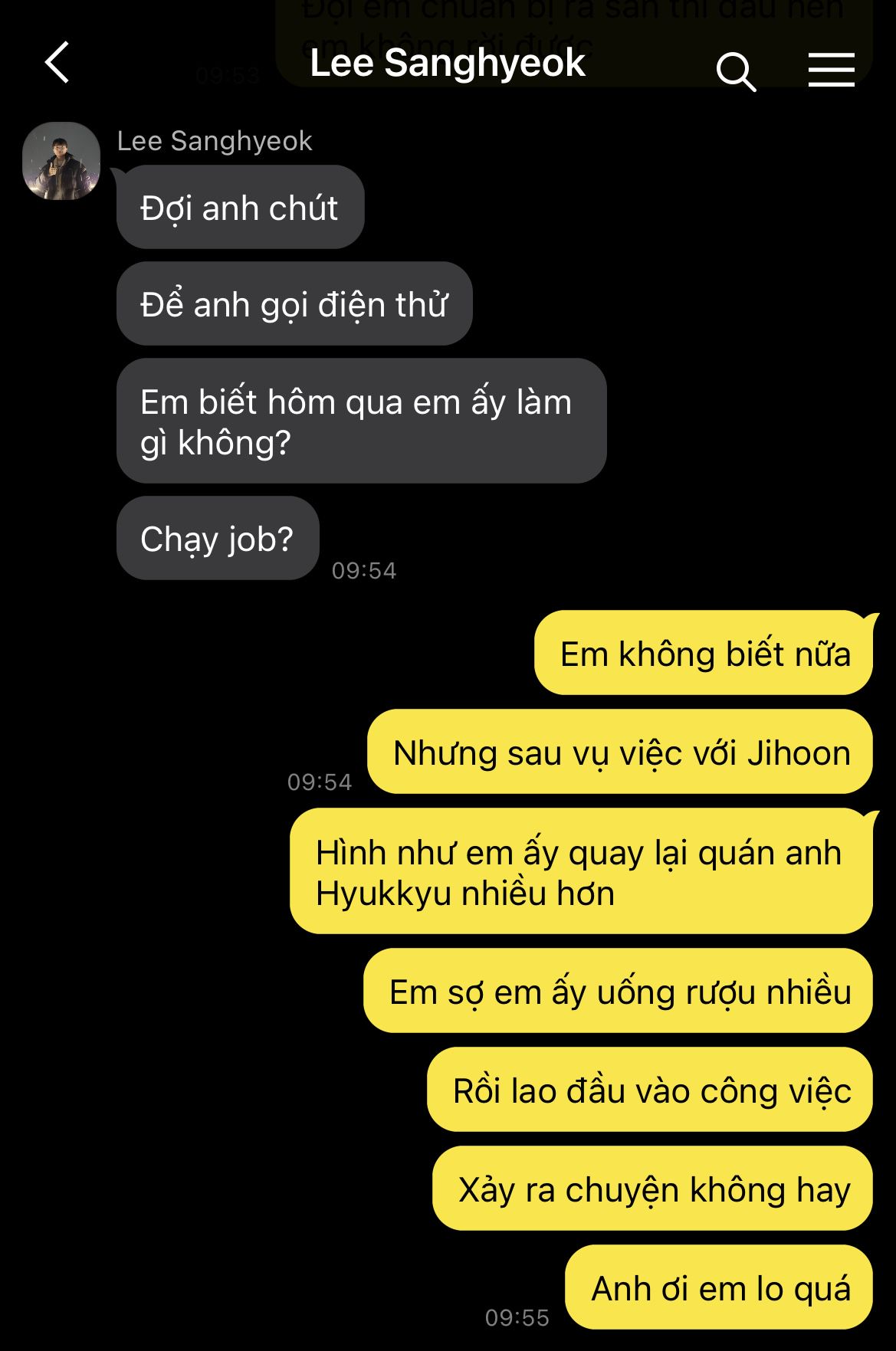Anh nhớ ra lúc nãy, sau khi đọc đến tin "không liên lạc được với Hyeonjun", anh đã bỏ dở, chỉ còn lại bản năng cuống cuồng chạy đi tìm, hoàn toàn không để ý gì tới việc phải trả lời tin nhắn tiếp theo của anh Sanghyeok.