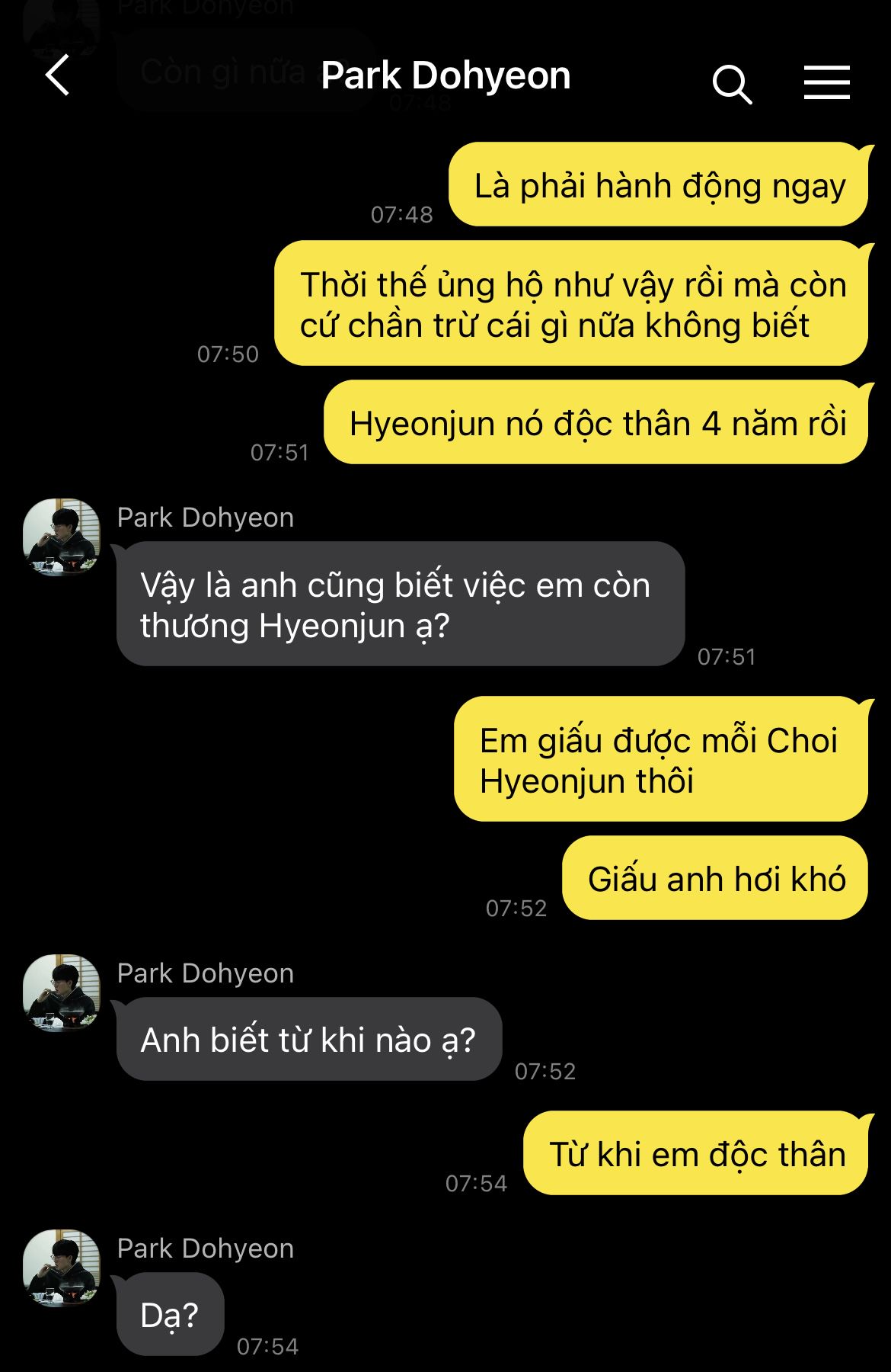 Điện thoại trong túi rung lên, phá vỡ sự lặng lẽ. Dohyeon giật mình, lấy ra nhìn. Trên màn hình, tên Lee Sanghyeok sáng lên cùng chuỗi tin nhắn.