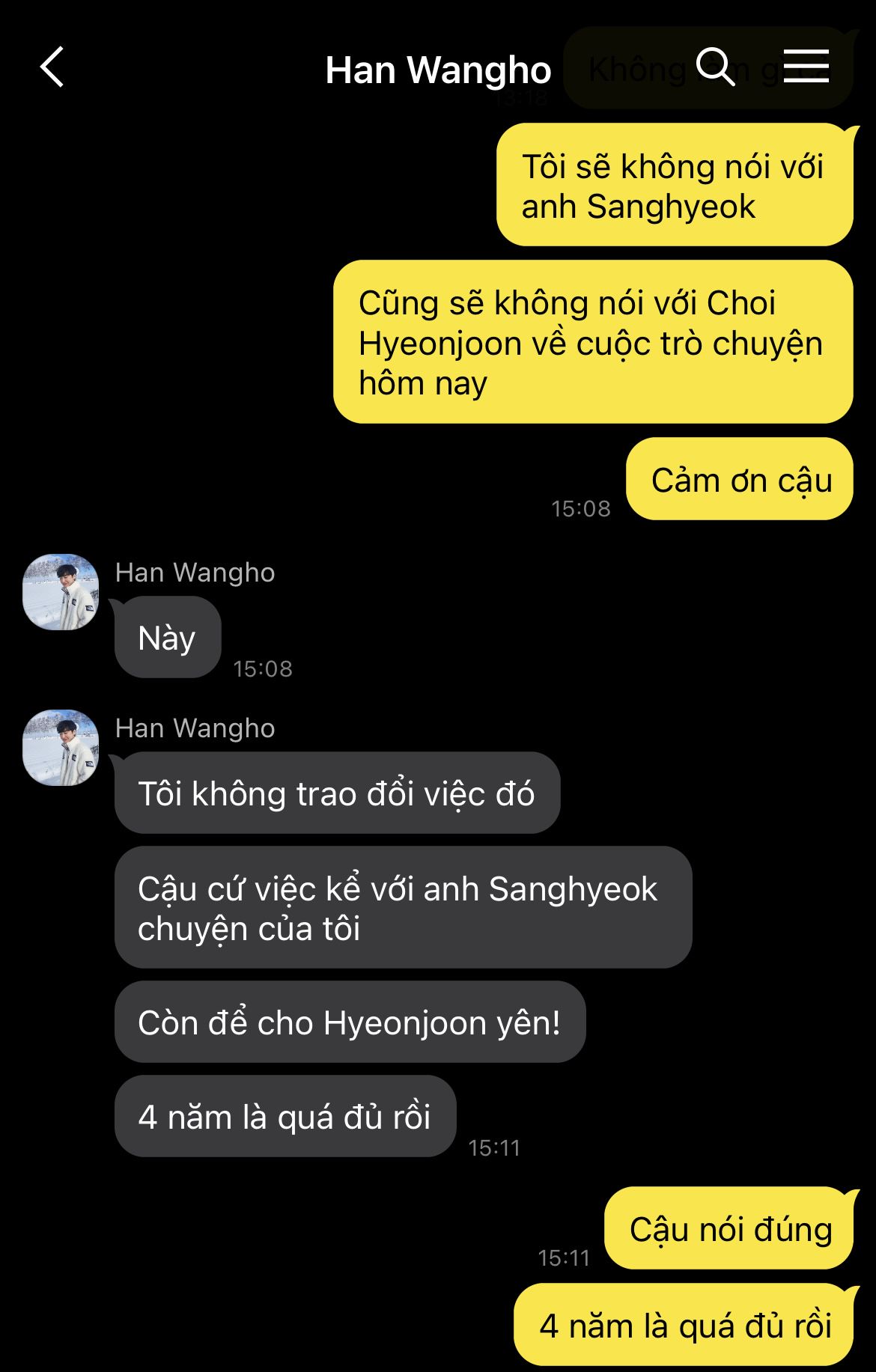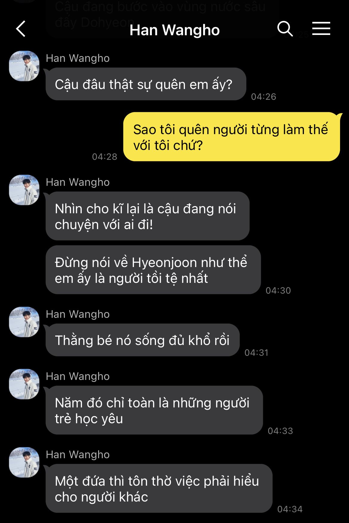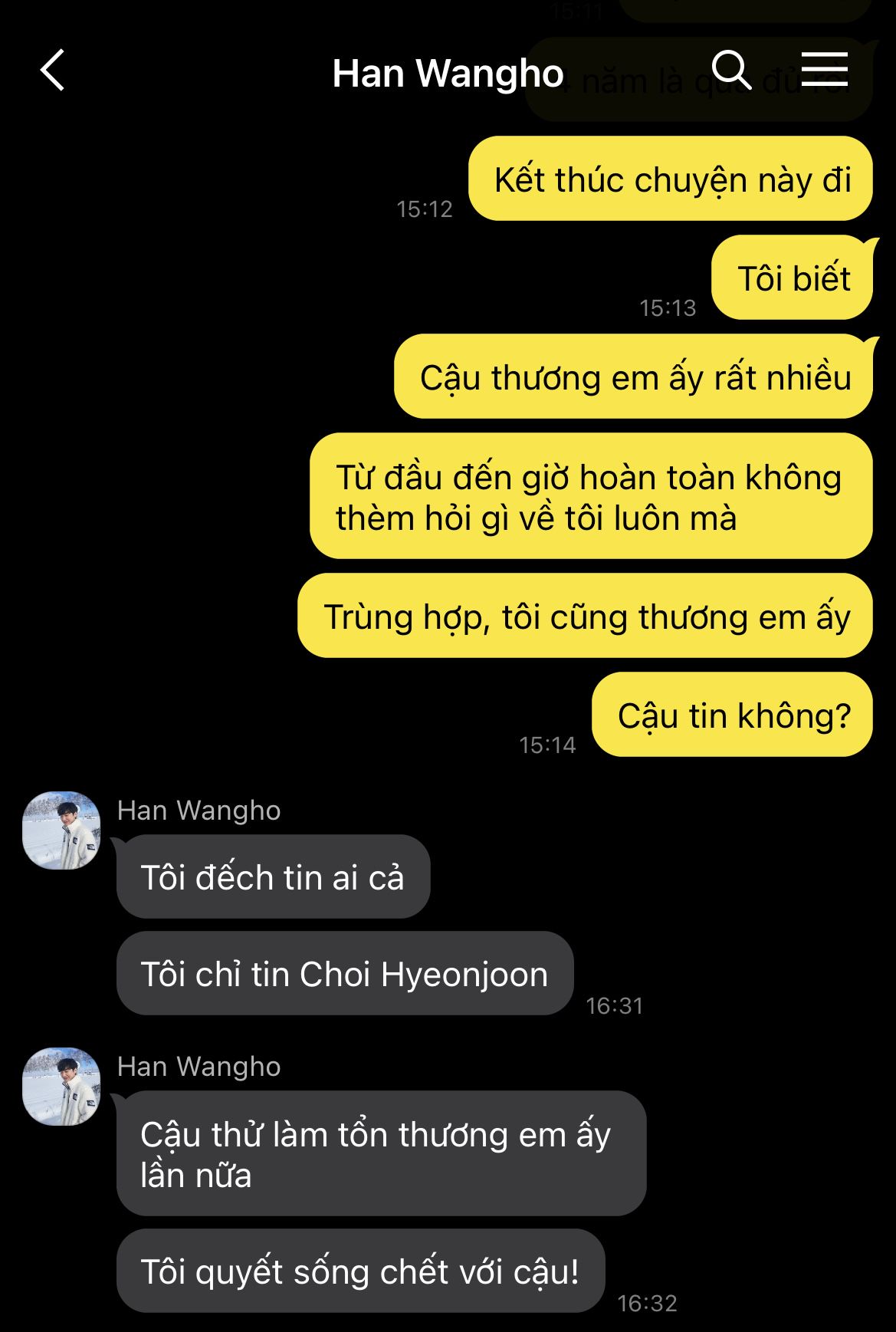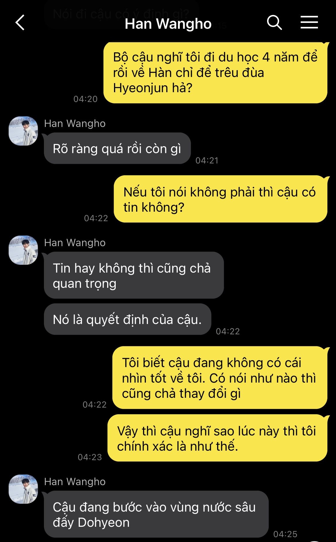 Tin nhắn khép lại bằng một câu đe doạ có sức nặng vô cùng lớn. Tưởng đâu đã chạm đến giới hạn khi đối mặt với phó chủ tịch, ai ngờ hôm nay lại được "vinh hạnh" gặp hẳn boss cuối. Nếu với Son Siwoo thì anh sẽ bị silent treatment còn trước Han Wangho thì đúng là bị nói cho vuốt mặt không kịp, hai người đó hai tính cách khác nhau như thế mà chơi thân được cũng lạ, may mà Park Dohyeon này cứng để còn đốp chát được qua lại chứ gặp kẻ nào yếu bóng vía chắc gãy cái một.