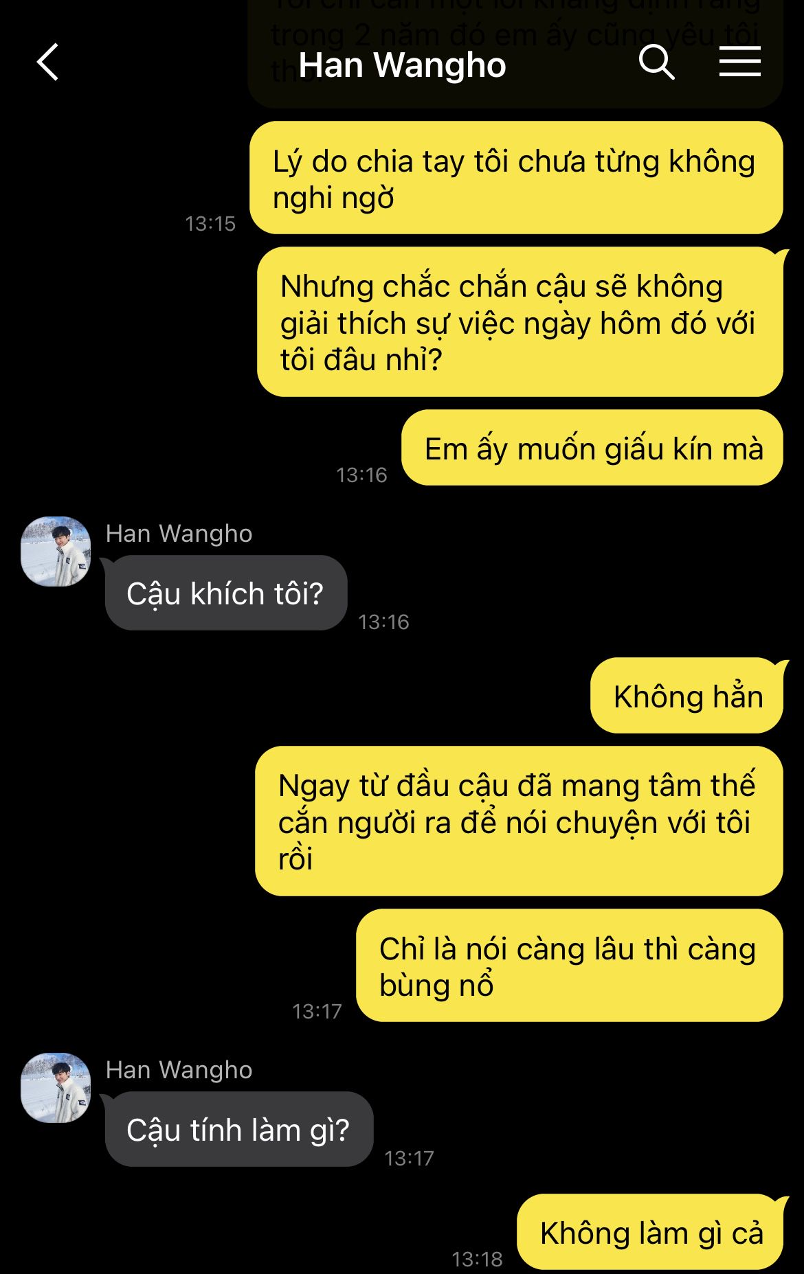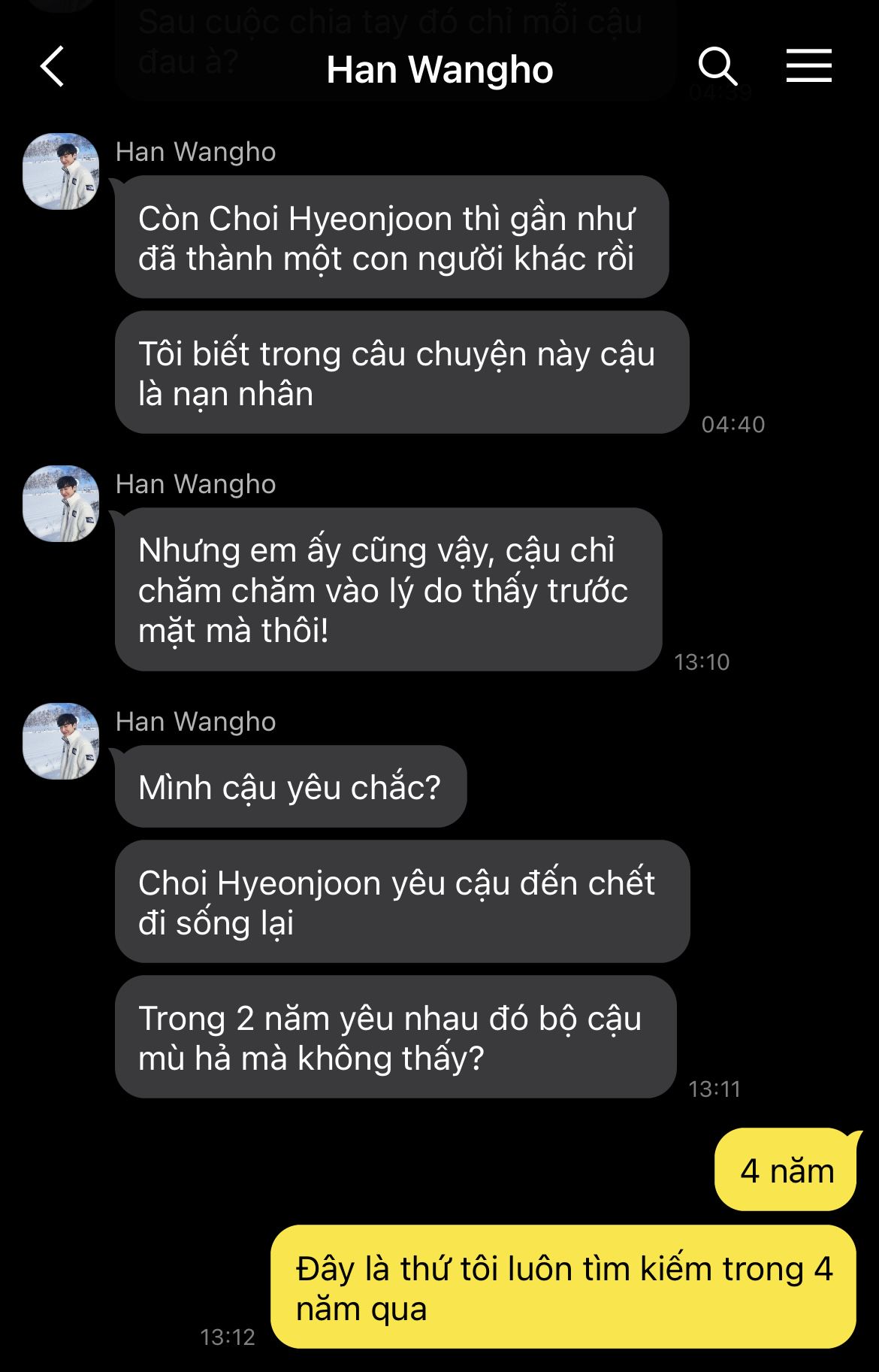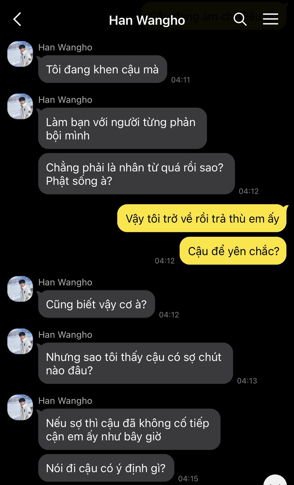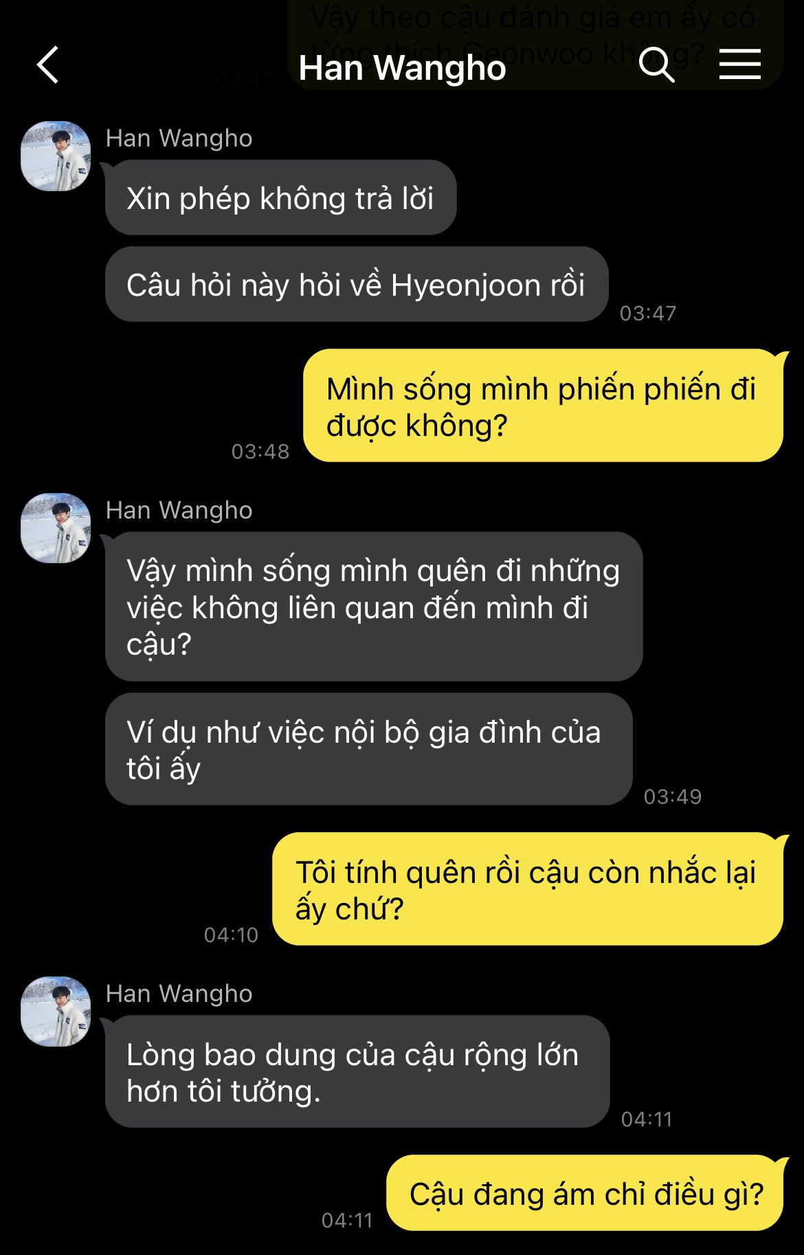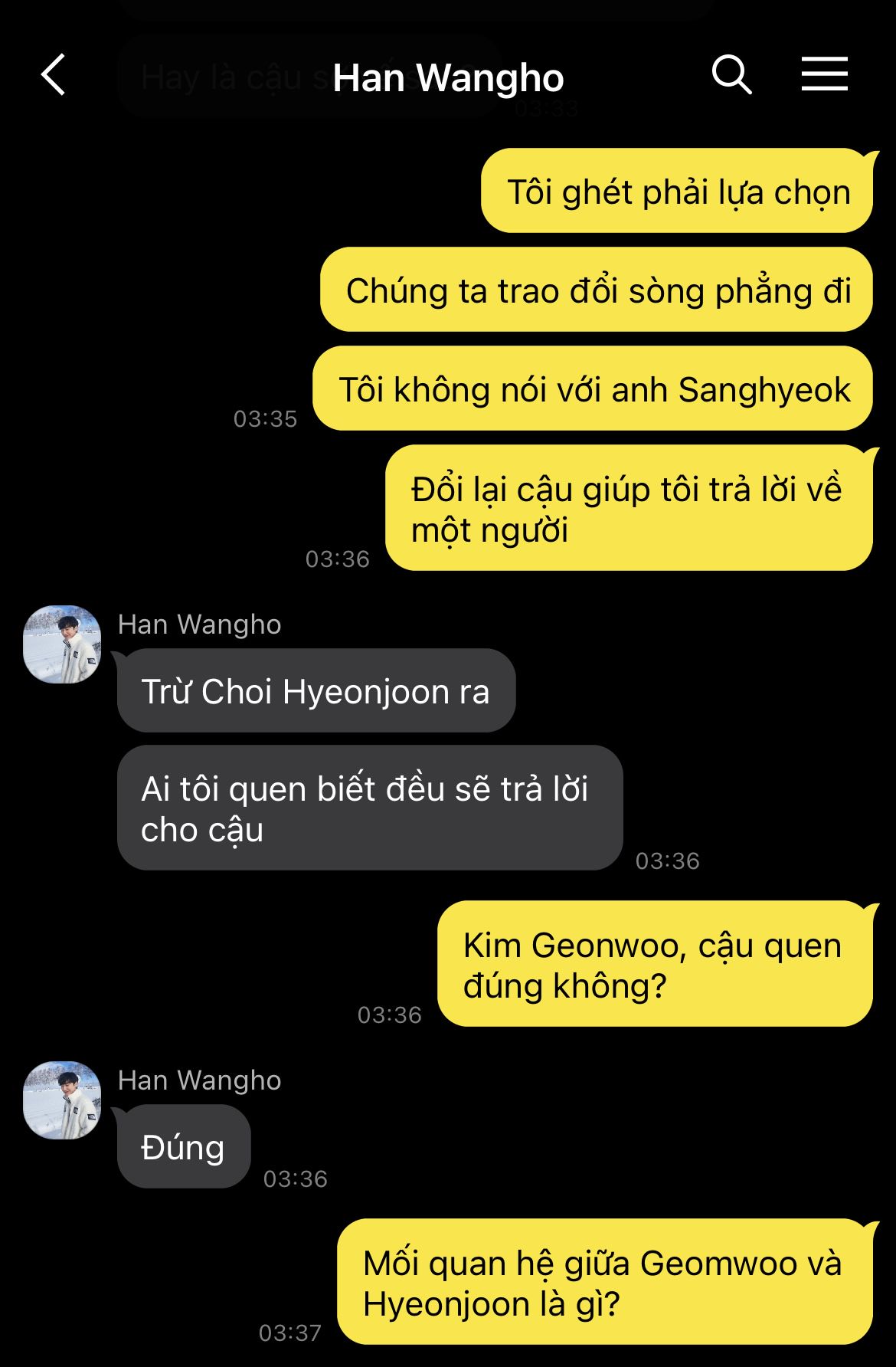 Tin nhắn khép lại bằng một câu đe doạ có sức nặng vô cùng lớn. Tưởng đâu đã chạm đến giới hạn khi đối mặt với phó chủ tịch, ai ngờ hôm nay lại được "vinh hạnh" gặp hẳn boss cuối. Nếu với Son Siwoo thì anh sẽ bị silent treatment còn trước Han Wangho thì đúng là bị nói cho vuốt mặt không kịp, hai người đó hai tính cách khác nhau như thế mà chơi thân được cũng lạ, may mà Park Dohyeon này cứng để còn đốp chát được qua lại chứ gặp kẻ nào yếu bóng vía chắc gãy cái một.
