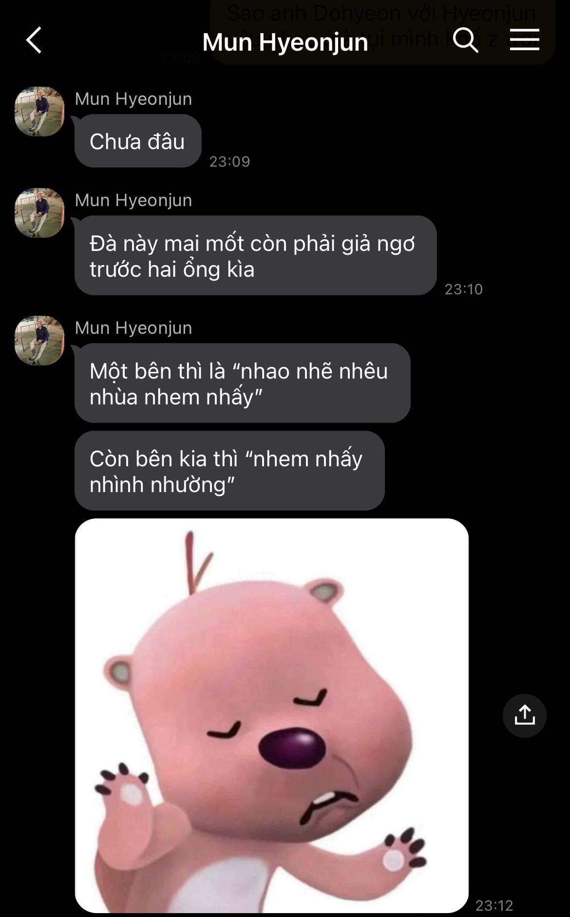 Hyeonjoon khẽ liếc về phía anh, ánh mắt chạm thoáng qua rồi lập tức né tránh, như thể tiếp xúc thêm một giây nào nữa cũng khiến tim cậu nổ tung. Cậu nhắm chặt mắt, hàm răng cắn khít, tiếng rít khe khẽ bật ra từ kẽ răng. Cuối cùng, cậu mở miệng, giọng run lên nhưng rõ ràng: