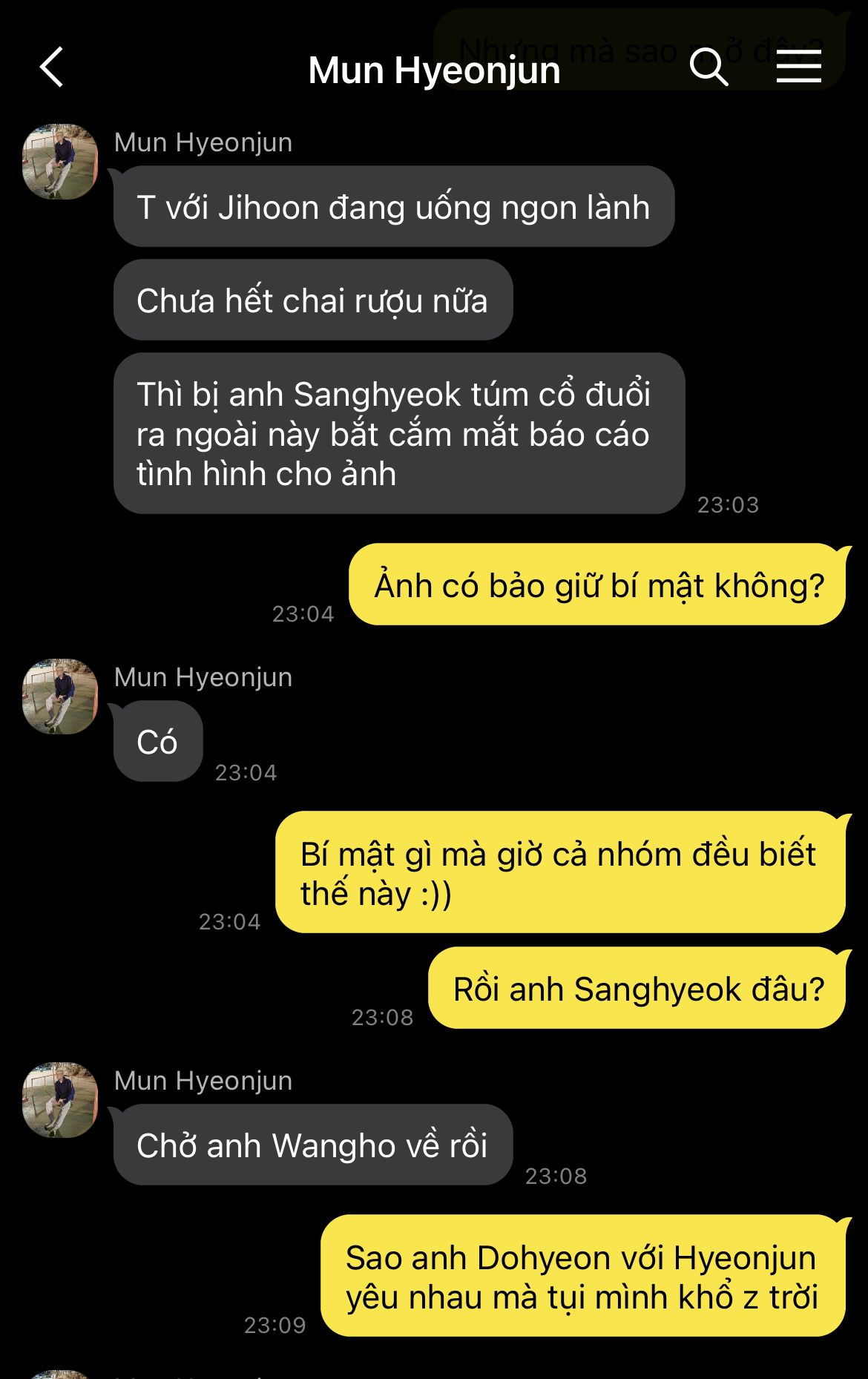 "Em hỏi..." Hyeonjoon nhấn giọng, lần này ánh mắt đã quay trở lại, sắc bén và đầy phẫn nộ. "Anh với anh Siwoo định cứ mập mờ thế này đến bao giờ?"