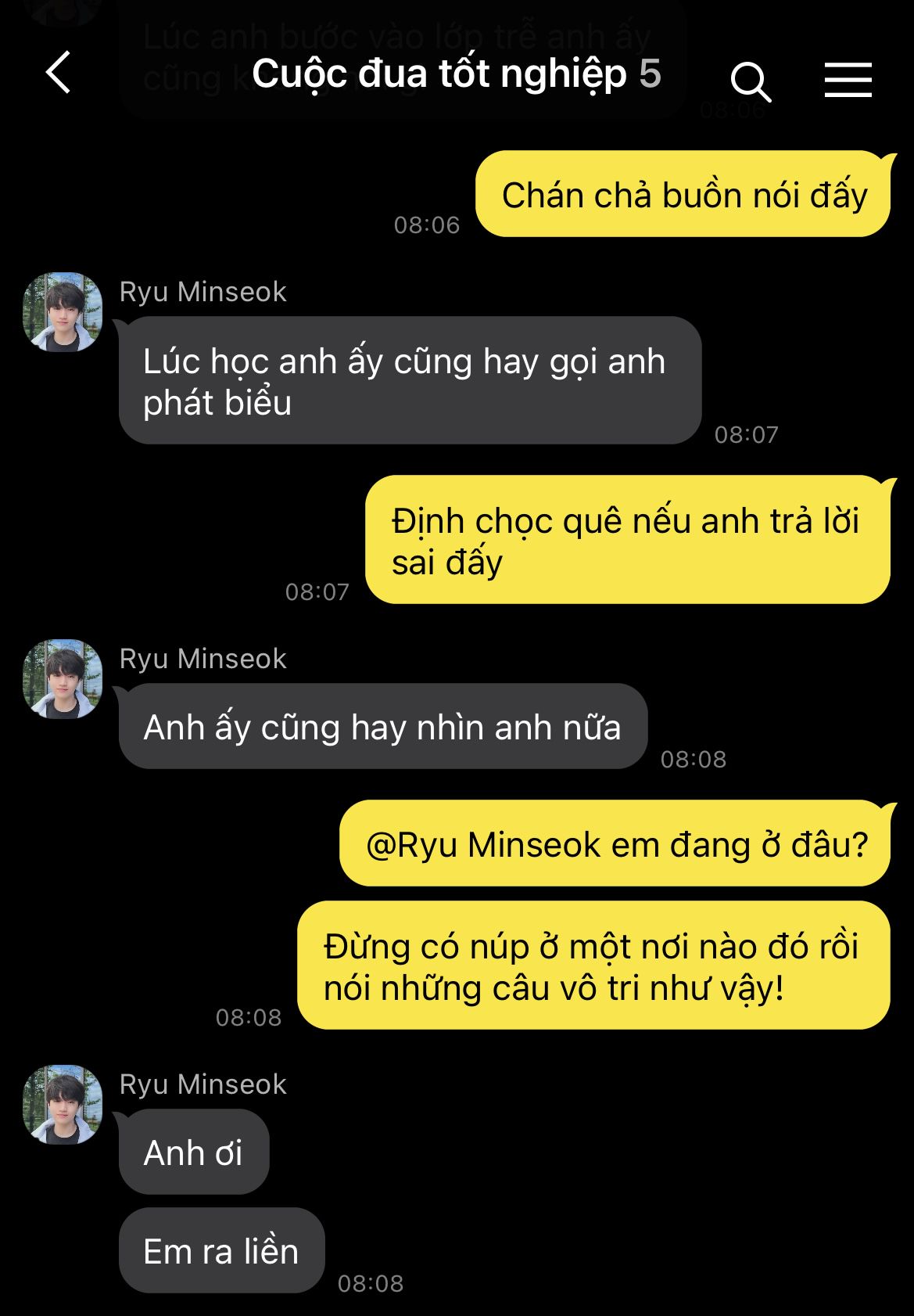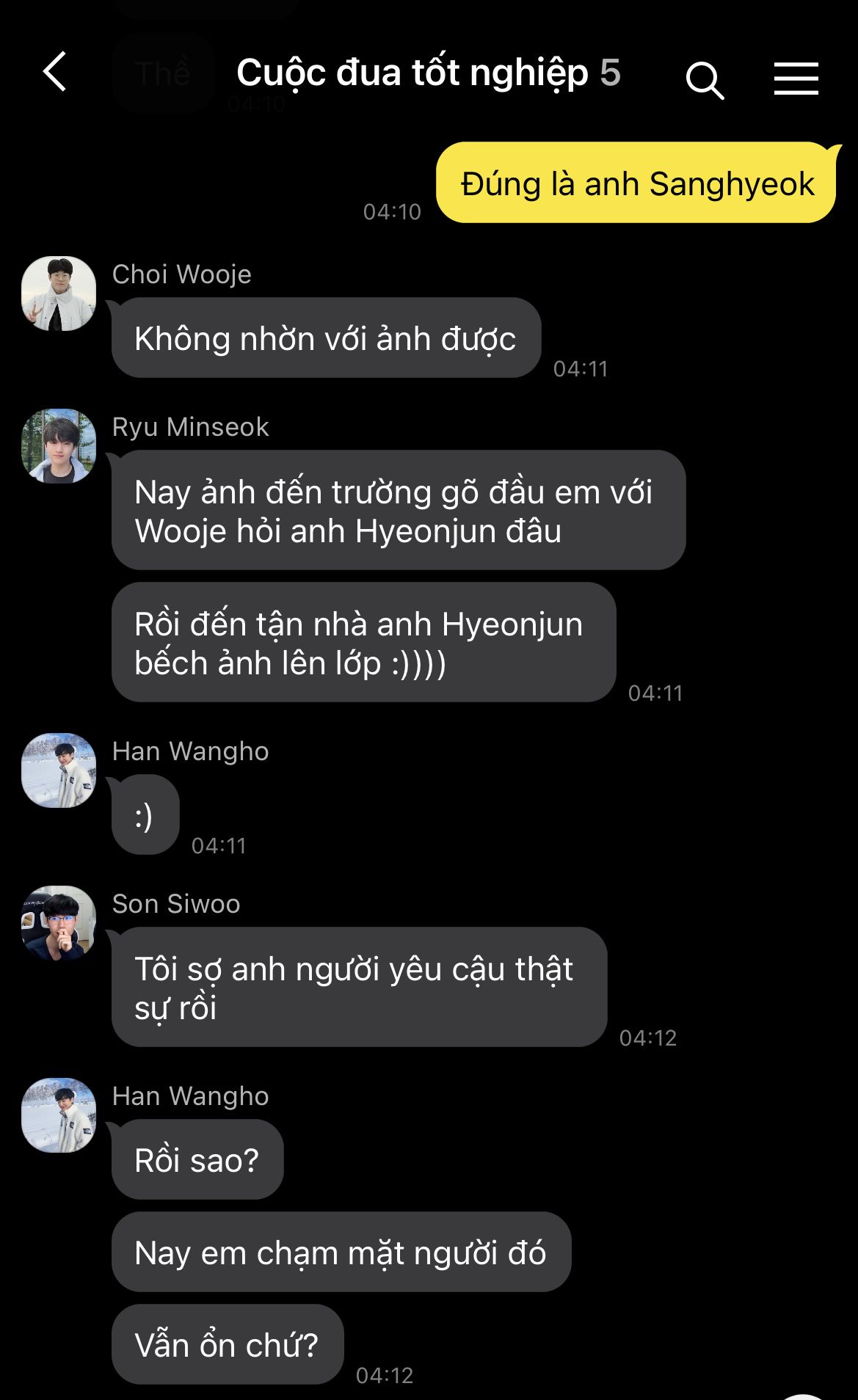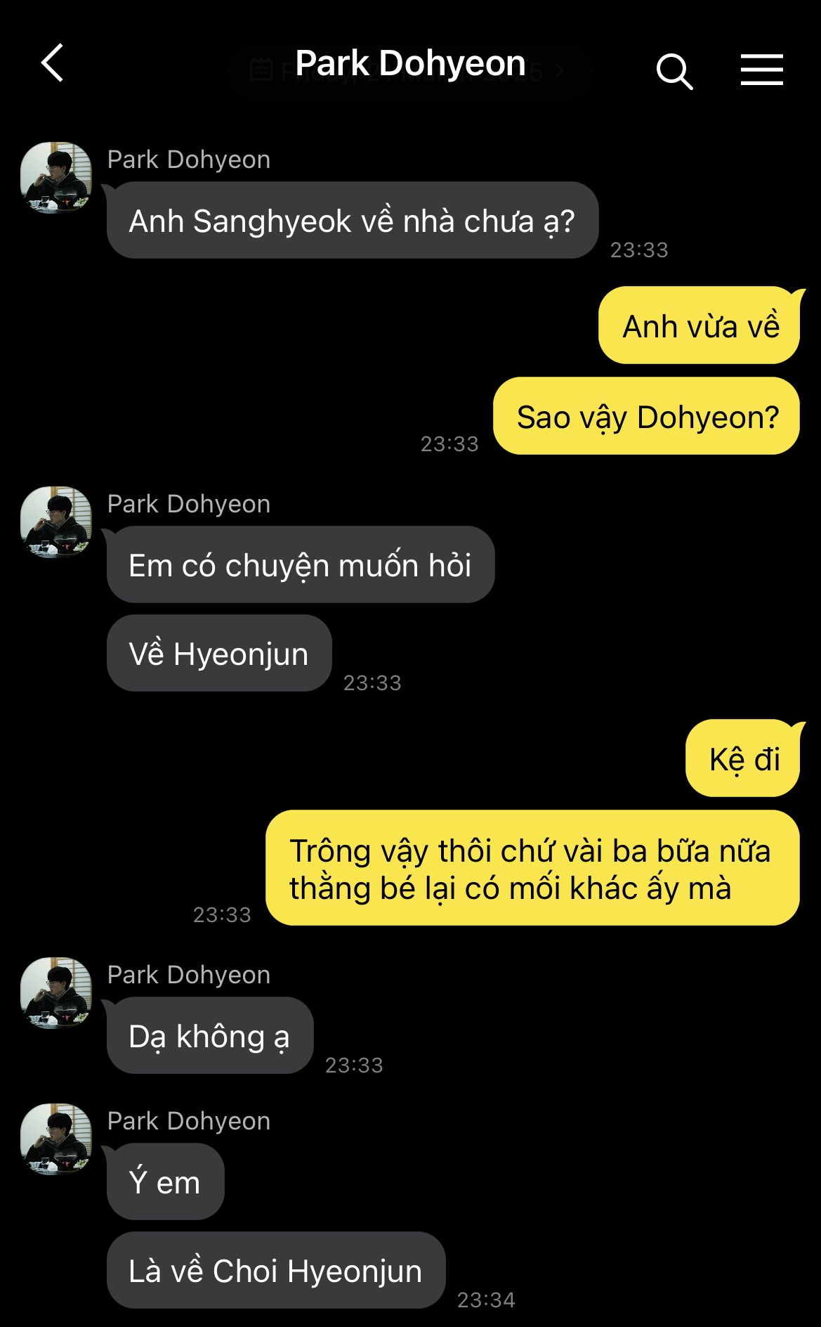Trái tim Hyeonjun hoảng loạn, nhịp đập dồn dập như muốn bật ra khỏi lồng ngực. Cậu cúi gằm mặt, vội vàng né tránh ánh nhìn ấy, như một kẻ trốn chạy khỏi quá khứ. Chẳng dám dừng lại dù chỉ một giây, cậu đảo mắt tìm kiếm bóng dáng hai đứa em trong biển người rồi nhanh chóng lách qua hàng ghế, len lỏi tiến về phía chỗ ngồi an toàn nhất có thể.