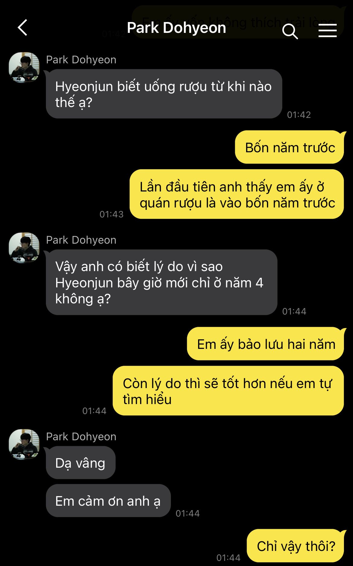Còn Hyeonjun... khoảnh khắc ấy, hơi thở trong lồng ngực cậu chợt nghẹn lại. Vẫn dáng người cao lớn với bờ vai rộng thẳng tắp, vẫn gương mặt góc cạnh đã khắc sâu trong trí nhớ cậu từ bốn năm về trước, và vẫn ánh mắt ấy - lạnh lùng, sắc lẹm như có thể xuyên thủng lớp vỏ yếu ớt mà cậu dựng nên. Trong thoáng chốc, tất cả như một cuốn phim cũ bị ai đó bất ngờ tua ngược, chiếu lại không bỏ sót khung hình nào.