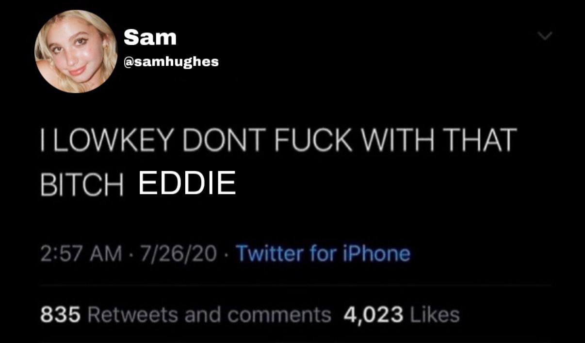 Anyway I can't be sappy and break my cool and nonchalant facade. I think it's funny that Sam has hella beef with Eddie. And he succesfully ragebaits her every time. And it's known that Sam usually is a sweetheart who gets along with everyone but she doesn't fw Eddie at all 😭😭😭