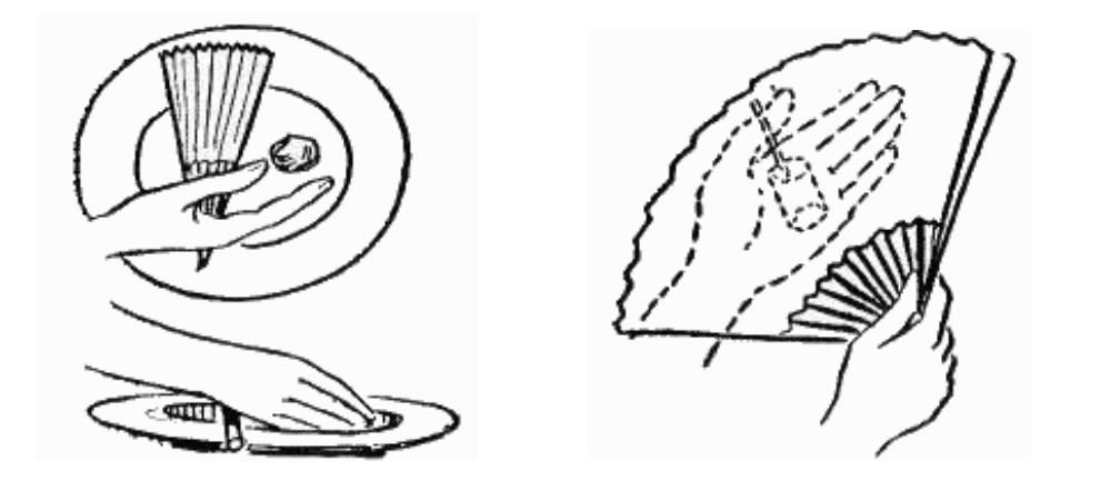 Reach for fan on hat with right hand, letting ball come a little beyond fan. Dip fingers slightly into hat and let ball drop into hat. Then pick up fan, allowing edge nearest to you, to come up first so that envelope attached to fan will pull up out of hat but will be hidden by fan.