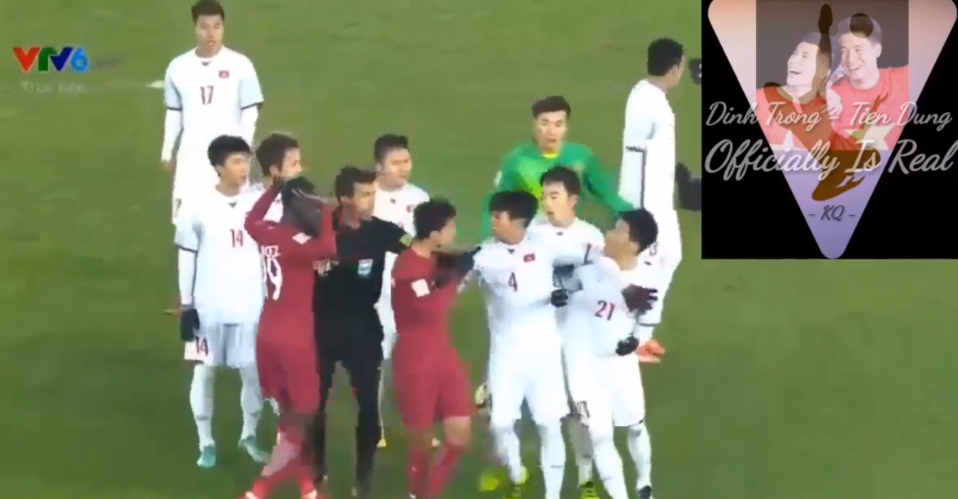 Đình Trọng không suy nghĩ gì nhiều, lập tức từ xa tiến tới đẩy mạnh lưng người vừa làm đau đồng đội mình mà trách móc một cách nặng nề dù cầu thủ kia không hiểu cậu đang nói những gì. Thế là cũng trong giây phút đó, một đồng đội khác của đối thủ liền sấn tới bảo vệ bạn mình.