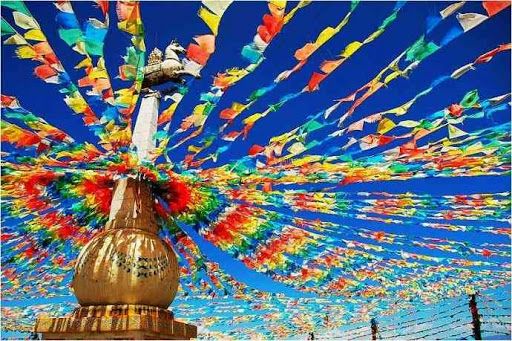 (1) Cờ cầu nguyện Lungta: ở Tây Tạng, cờ cầu nguyện nhiều màu được treo trên đỉnh núi, ven sông, đường, đền thờ và những nơi mà họ coi là hào quang có thể được nhìn thấy ở khắp mọi nơi, những lá cờ này được in kinh Phật giáo, cầu nguyện mang những ân phước, điều tốt lành đến với chúng sinh.