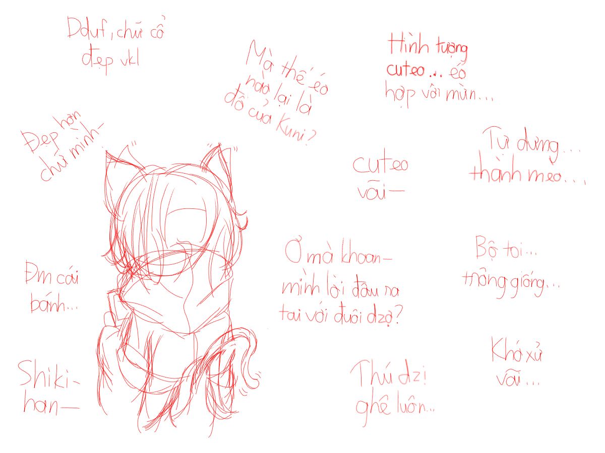 Tại vì... tên cô- tên của cô ấy, nó là Kuroka Yuuki mà. Nên là toi muốn vẽ cái gì đó ngầu ngầu, liên quan đến đỏ với đen một chút.