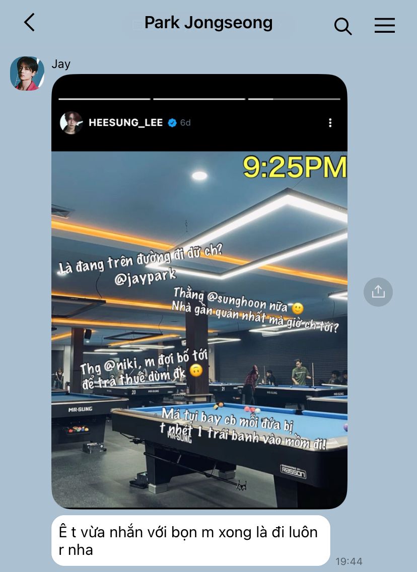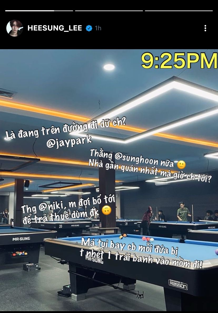Nửa tiếng sau, Sunghoon cuối cùng cũng tới và phải nhận trả toàn bộ tiền thuê hôm nay. Sau đó cả bọn bắt đầu đấu 2v2, do oẳn tù xì quyết định. Heeseung và Niki hạng 3,4 nên phải chung đội với nhau.