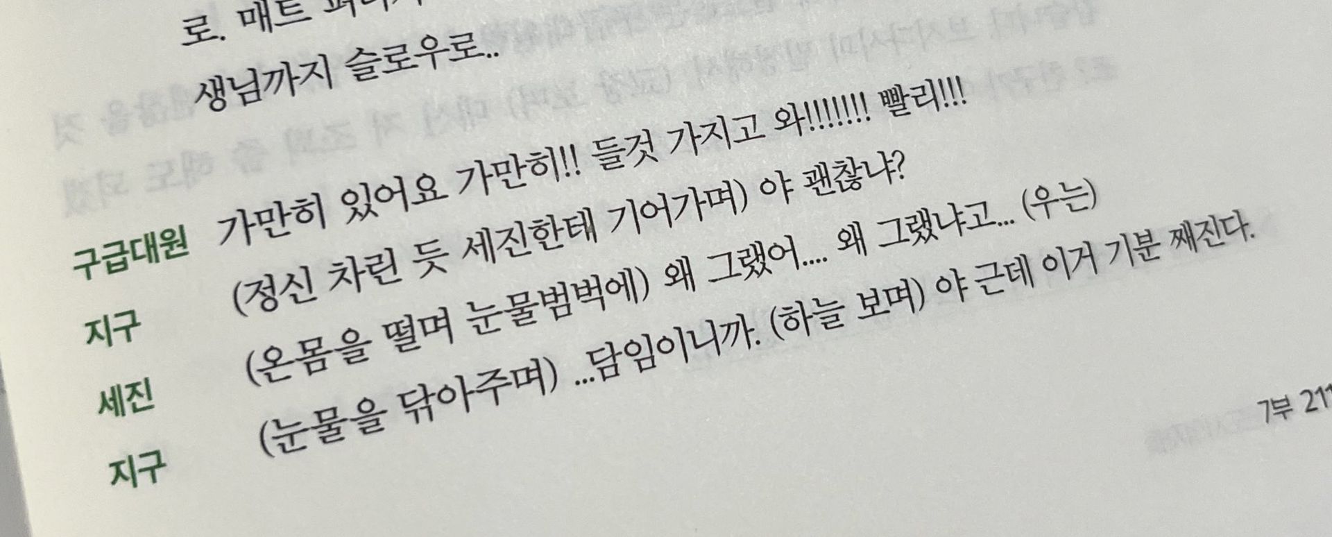 Với lại, một học sinh đột nhiên đến văn phòng giáo viên, tìm Jigu và nói 'em như thế này, em như thế kia, em đã làm việc này, việc kia'... Làm gì có học sinh nào tự dưng lại như thế, đúng không? (T/N: Ý là Jigu đã vô tình và không nhận ra những dấu hiệu khác thường của Sejin, kể cả việc em nói mượn chìa khóa sân thượng để chết luôn cho xong, cô cũng xem nhẹ và không để tâm)