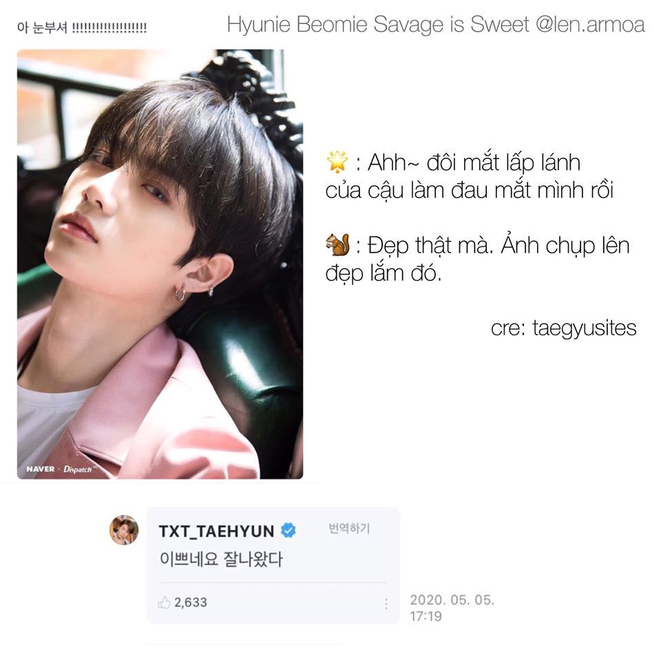 Thấy cậu tự nhiên bật cười, Beom Gyu ngó đầu qua nhìn vào điện thoại điện thoại Tae Hyun.