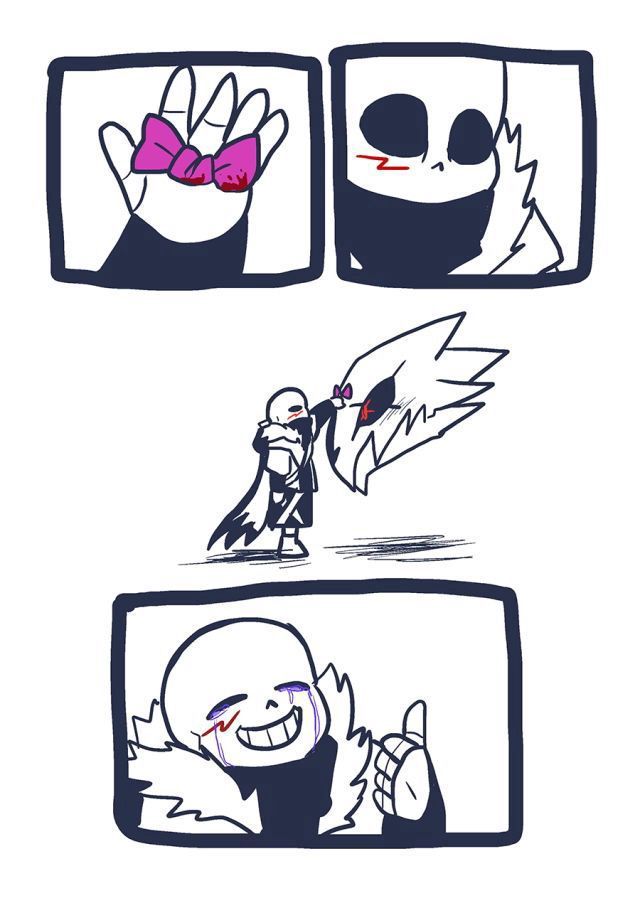 Sans trầm lặng cầm chiếc nơ hồng vương mùi máu đã ố sang màu đỏ sậm của máu tươi, còn đâu màu hồng đáng yêu năm nào... Hắn vươn tay lên, cẩn thận đeo cho con Gaster Blaster mà hắn yêu quý nhất.