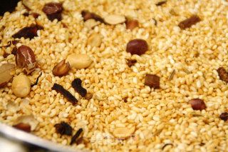 5- Cho gạo và đậu phộng đã ráo nước vào xào liên tục.