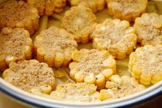 16- Cắt bắp thành từng khúc khoảng 1cm (không giới hạn, miễn là độ dày bằng nhau), lăn qua bột đã chuẩn bị, đặt lên trên vỏ bắp.