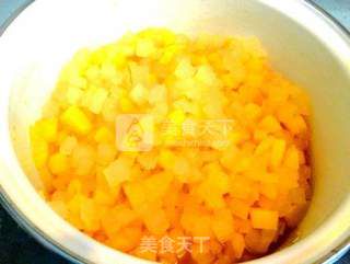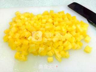 1- Gọt vỏ thơm, bỏ phần lõi, ngâm nước hòa chút muối trong nửa tiếng, để ráo rồi cắt miếng nhỏ.