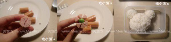 4- Cắt xúc xích thành khúc vừa ăn, tỉa hoa như hình, nhồi hạt đậu hà lan vào trang trí. Tạo hình cơm (có thể trộn cơm với nước tương).