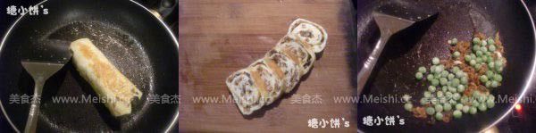 2- Quết một lớp dầu lên chảo, đổ một lớp trứng, rắc bào ngư (có thể chọn nguyên liệu khác nếu không có sẵn), cuộn lại, sau đó tiếp tục đổ thêm một lớp trứng và bào ngư, lặp đi lặp lại cho tới khi dùng hết trứng đánh.