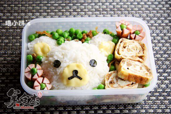 5- Đổ hỗn hợp bào ngư xào đậu hà lan vào các khoảng trống, xếp trứng cuộn, xúc xích vào, trang trí mặt gấu bằng phô mai, rong biển.