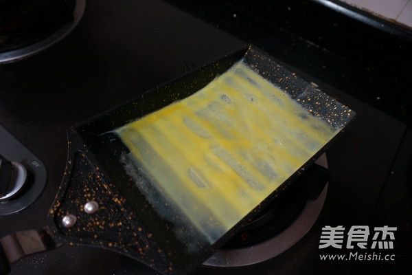 3- Đánh trứng, nêm ít muối. Chiên trên chảo vuông hoặc chảo có đường kính nhỏ, đổ một lớp đầy.